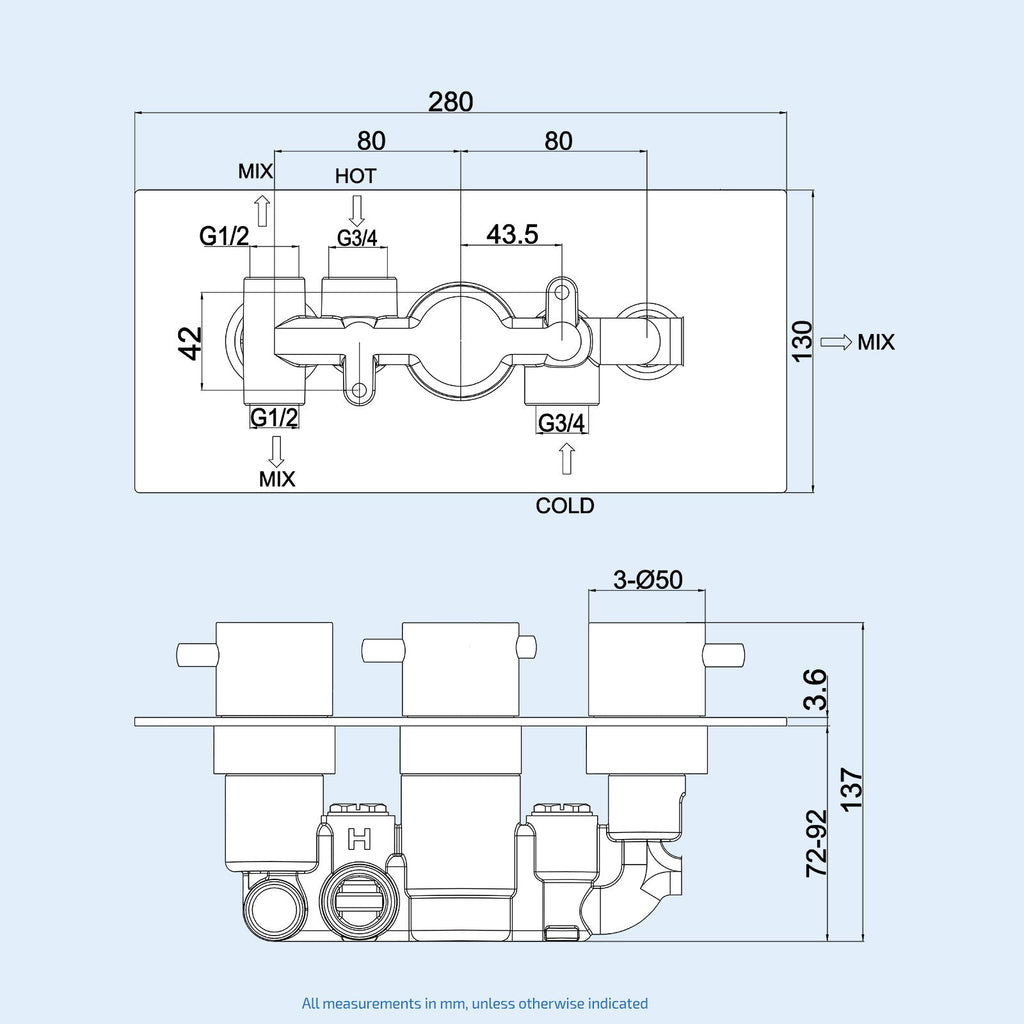 - Built in non return valves to prevent back flow and filters to protect the thermostatic mechanism