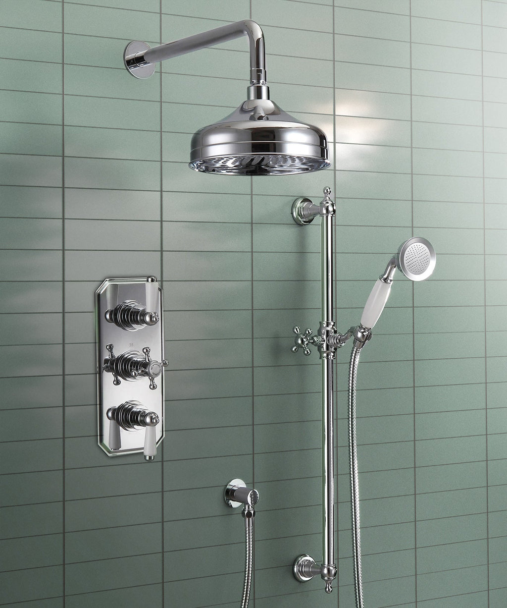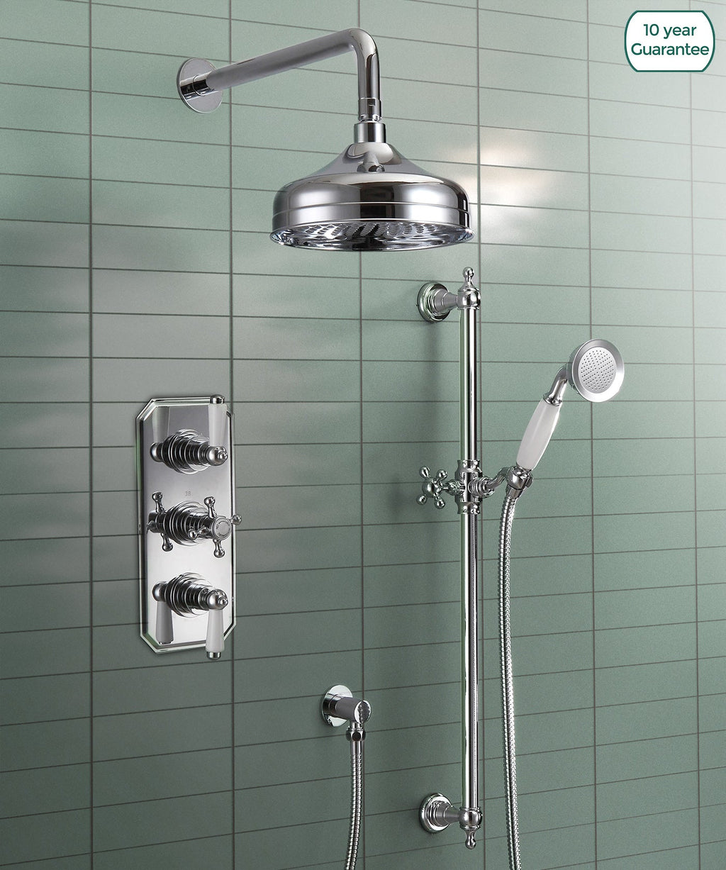 Enhance your bathroom with a beautiful traditional complete 3 dial 2 way concealed thermostatic shower set featuring a shower head and handset for ultimate shower versatility and easy controls with long handles making it easy to use. The concealed valve offers thermostatic showering via two easy-to-operate controls, for temperature and flow.