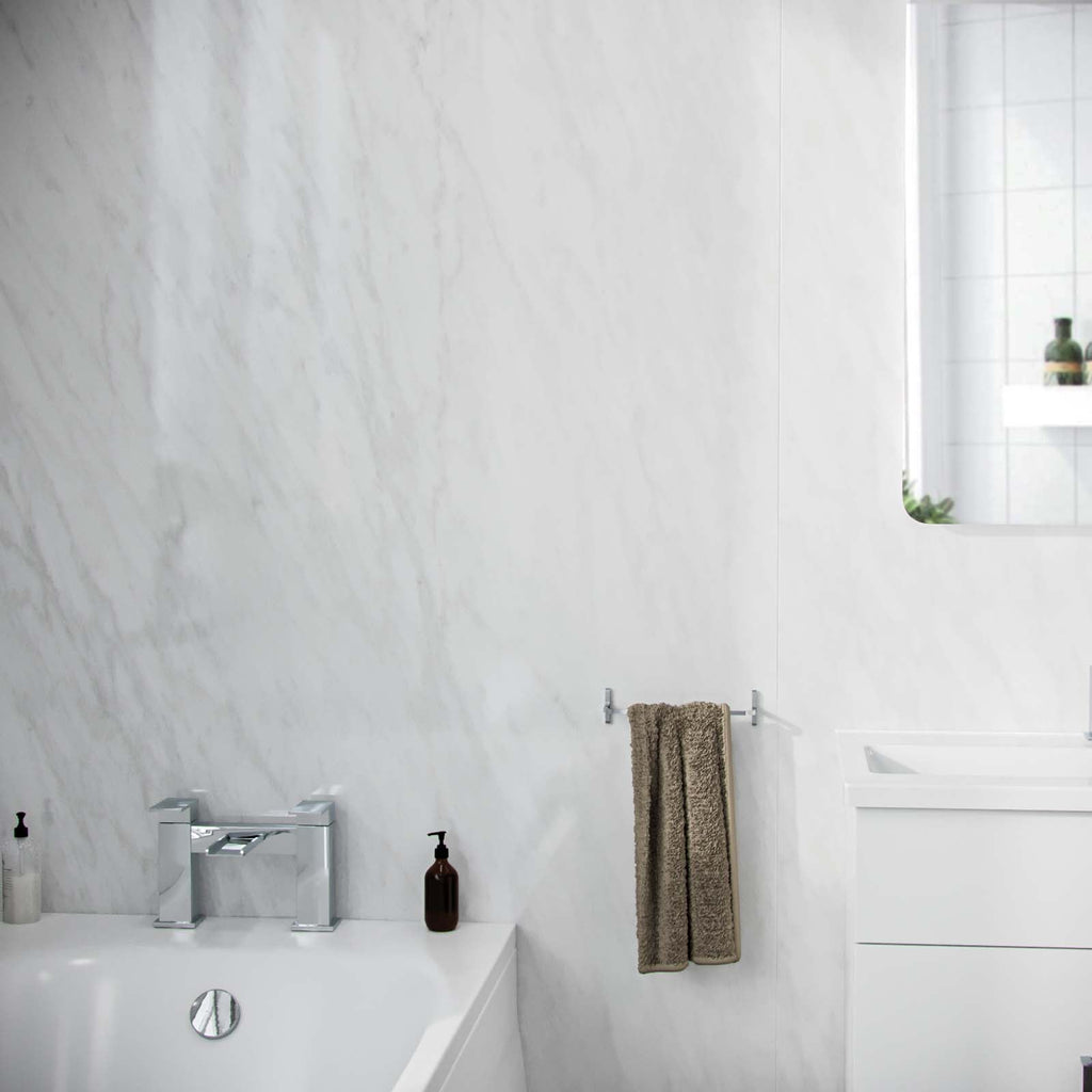 Our PVC panels are reliable, easy to clean, easy to fit, rigid light, waterproof and Class 1 fire rated. White Marble Wall is one of our most popular styles. A stylish White Marble cladding for a dramatic finish. PVC bathroom cladding is a great product for giving your bathroom a complete make over at a fraction of the price of tiling. And it’s much easier than tiling too, so most people with general DIY skills can give it a go and save on tradesman costs. Our bathroom cladding meets the absolute highest quality standards.