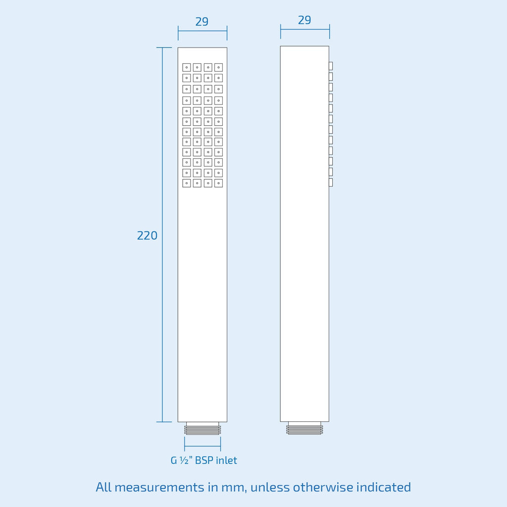 This rectangle single mode handset has a matte black abs finish & is perfect for a range of shower types.