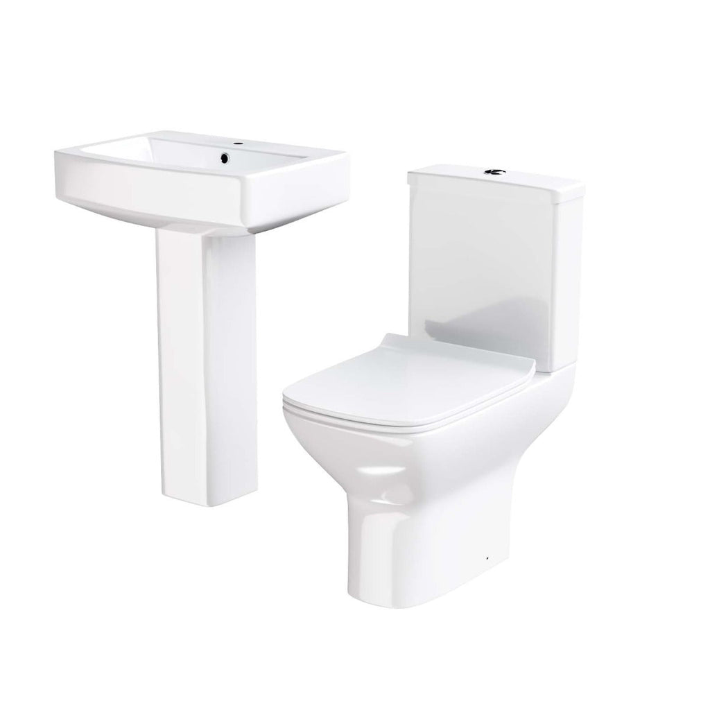 This beautiful 560 mm full pedestal Square basin comes complete with a ceramic rimless close-coupled toilet.