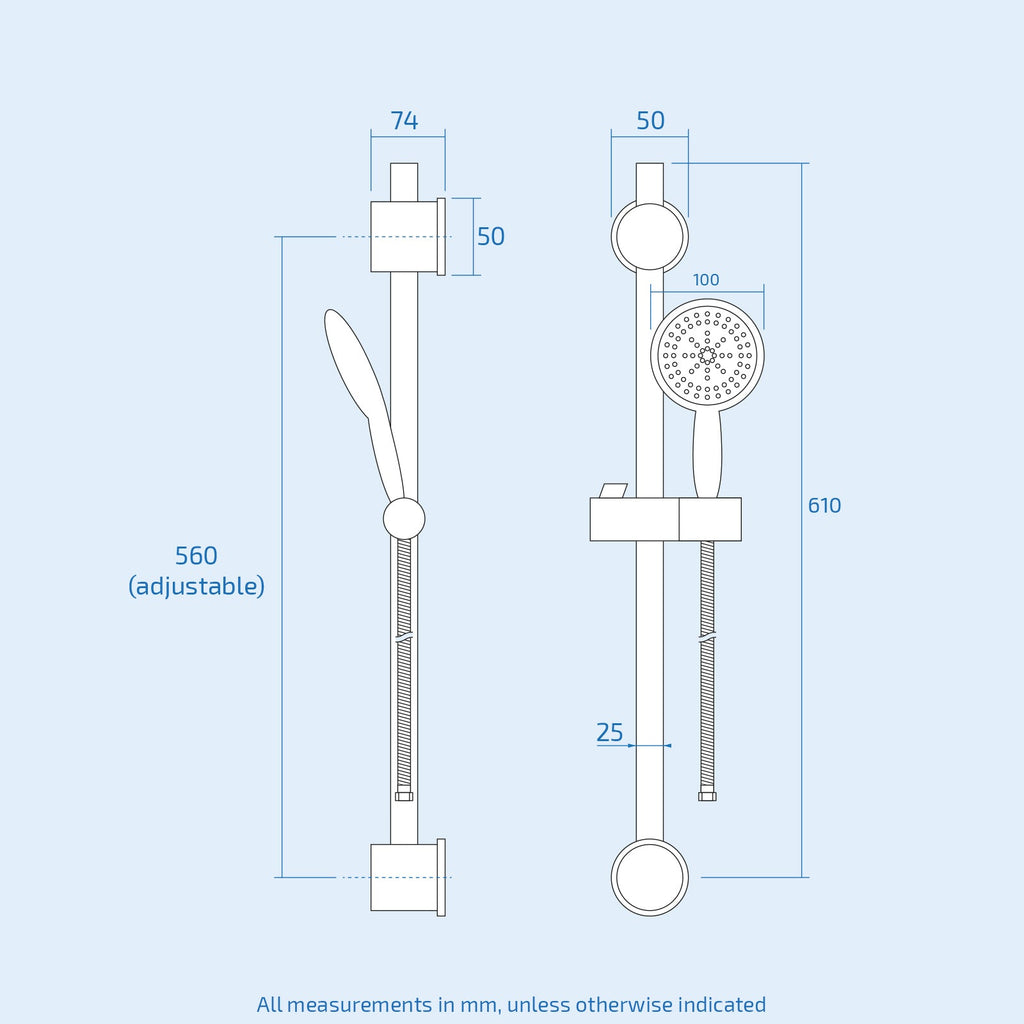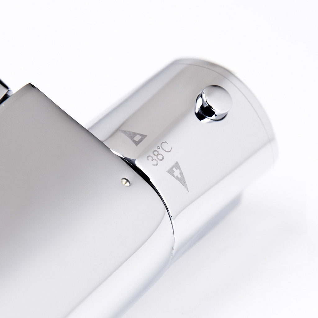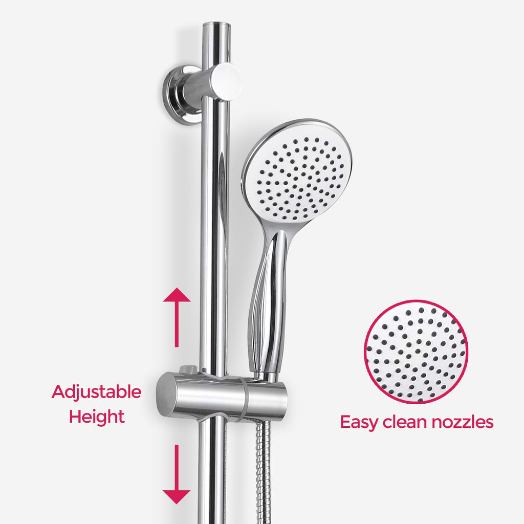 This thermostatic shower mixer with a bar valve allows you to halt or control the flow of your shower, whilst the thermostatic control gives complete temperature performance, suitable for any modern bathroom. The left diverter controls the water the water on/off and the water flow and the diverter on the right controls the temperature which has a safety stop preset as a set temperature of 38 degrees C. for comfort and safety. The slider rail also comes with an adjustable bracket for the handheld shower allowing you to change the angle of the the handset and move it up and down to suit your preference.