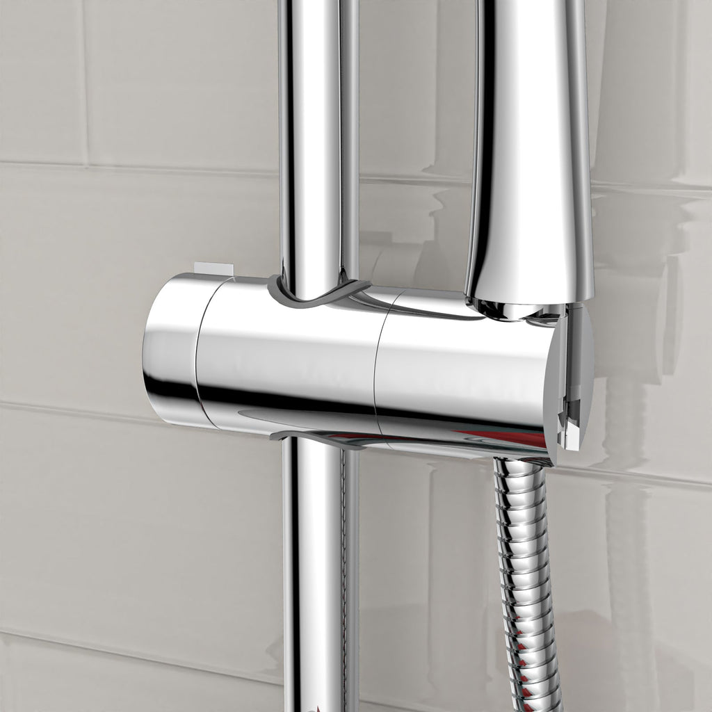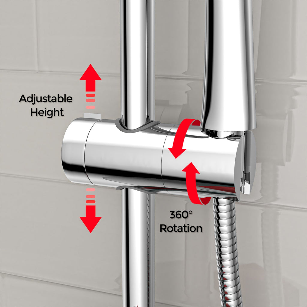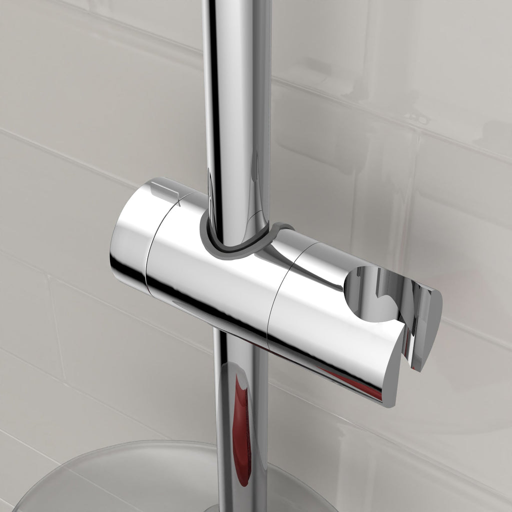 This slider bracket in chrome fits shower rails with a push-button mechanism that lets you adjust height effortlessly. It also allows flexible positioning of the handset. It installs easily and holds securely in place for reliable daily use.
