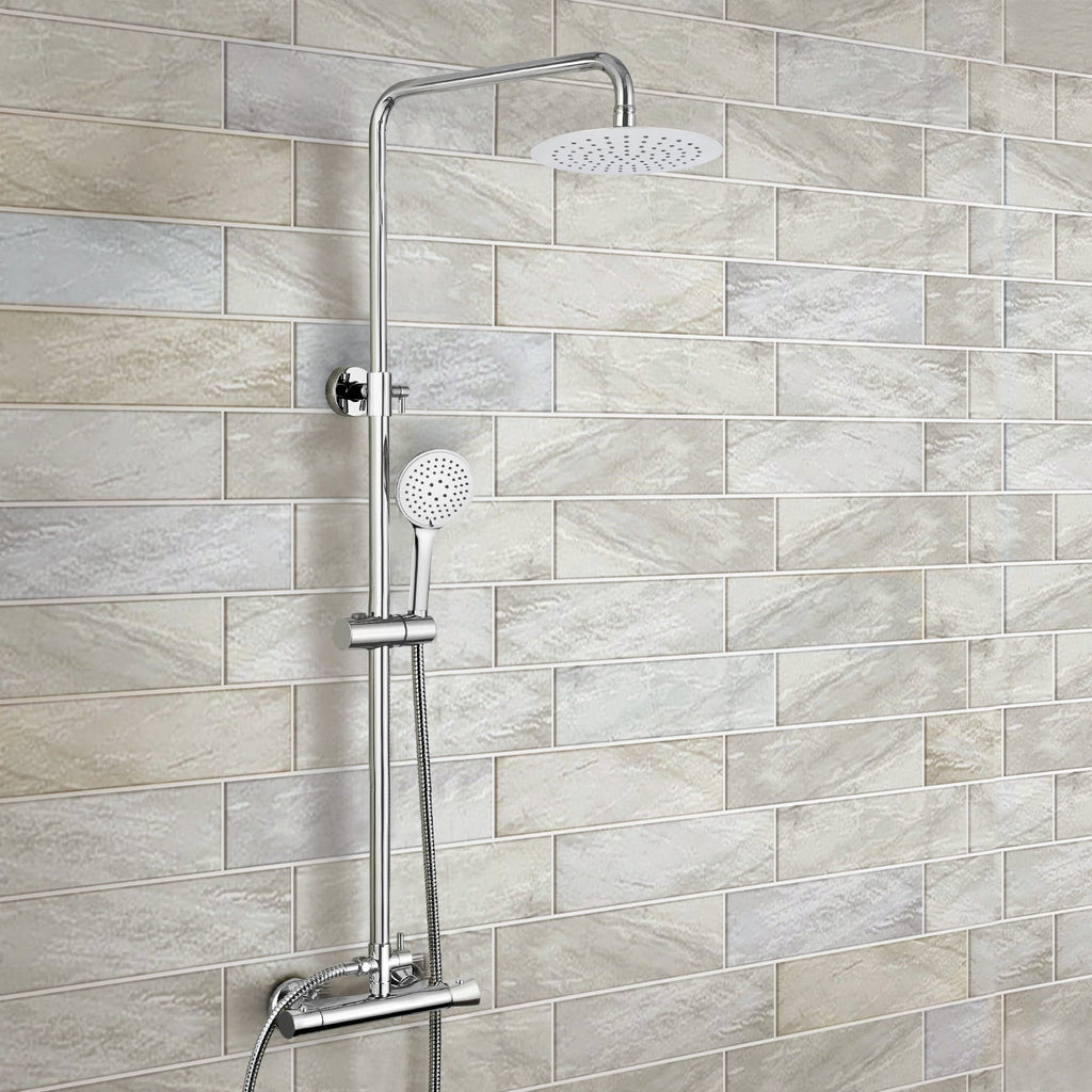 This solid brass round thermostatic exposed shower mixer - chrome dual kit riser pack is a sleek and modern design and a cost effective showering solution. The thermostatic valve allows you to halt or control the flow of your shower whilst the thermostatic control gives complete temperature performance, suitable for any modern bathroom. The left handle on the bar shower controls the water on/off and the water flow and the right handle controls the temperature, with a range of 20-50 degrees C. which also has a safety stop preset as a set temperature of 38 degrees C. for comfort and safety. There is also a diverter at the end of the hose to switch between both the outlets; shower head and shower handset. The slider rail is adjustable to suit your preference and height of the riser rail can also be adjusted from 905 mm-1260 mm and also comes with a 360 degree adjustable bracket for the handheld shower, which you can also slide up and down the rail to suit your preference.