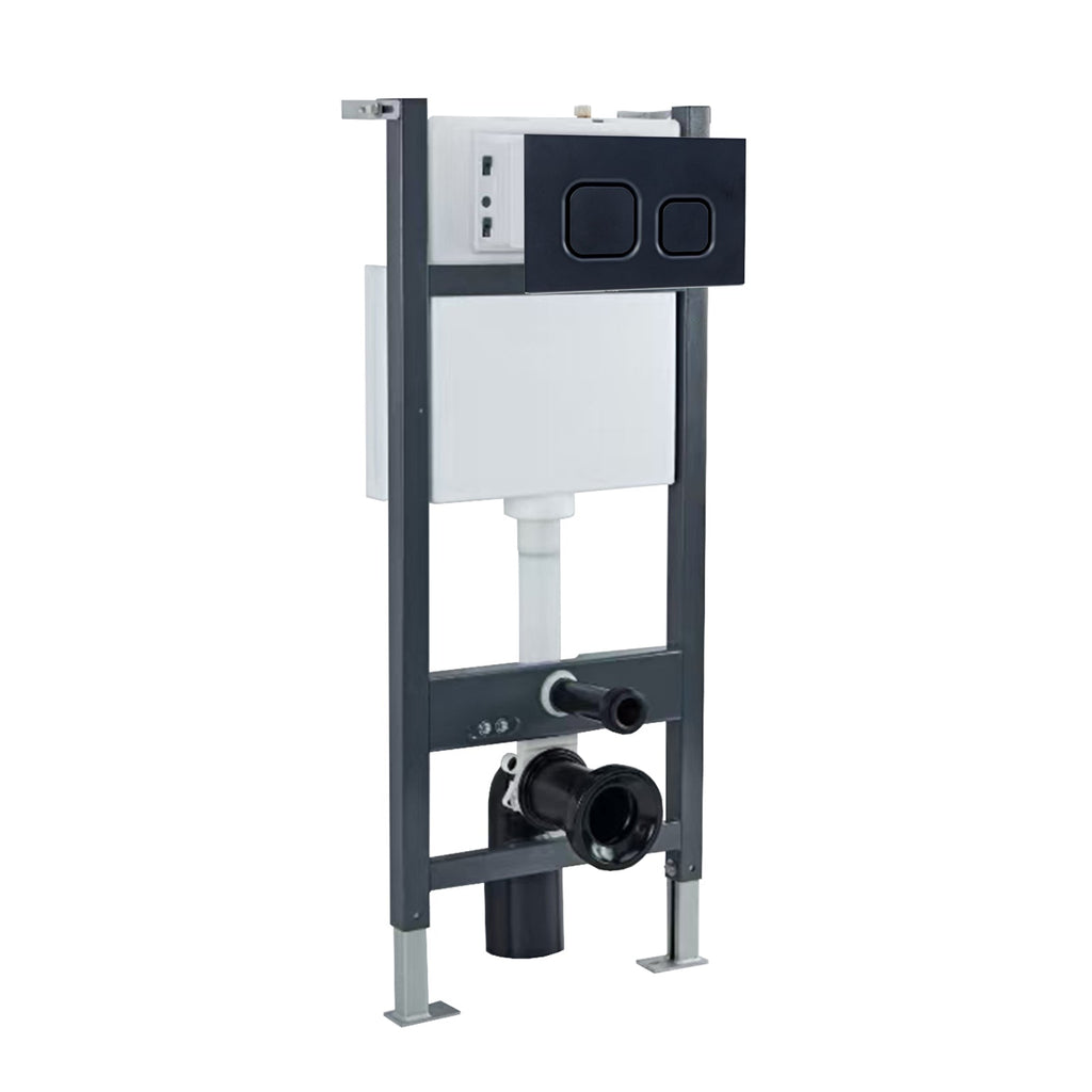The Round Rimless Wall Hung Toilet Matte Black features an innovative design incorporating a rimless pan which halts bacteria build up and makes cleaning a breeze. Also, the soft close toilet seat and cover which makes it safe for people of all ages to use and helps prevent fingers from getting trapped. It features a front dual flush cistern with flush plate and buttons. This frame offers robust support for your wall-hung toilet, ensuring durability and longevity. Additionally, the frame is adjustable in both height and depth, allowing for an optimal fit and seamless integration with your toilet. Its sleek, minimalist design enhances the overall aesthetic of the bathroom. Expertly crafted using only the finest ceramic and finished in matte black, this superb piece would be the perfect companion for any modern minimalist aesthetic.