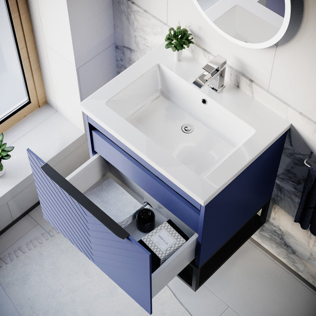 The Wall Hung Drawers Basin Vanity, Black Frame, Handle has an aesthetic symmetry textured design making the vanity unit complement to any modern bathroom. This vanity unit provides ample space of storage with two drawers to store your bathroom essentials. The drawers feature a brushed finishing handle for easy access. The soft-close mechanism ensures gentle and quiet use without slamming. This vanity unit is a wall-mounted design. Along with a framed shelf for extra storage, it gives you an unclutter look with freeing up floor space. It is made from 100% moisture-resistant MDF, topped with a durable and easy to clean basin sink. This vanity unit is an excellent option that will bring a touch of luxury style and functionality to your bathroom. It's time to upgrade your space!