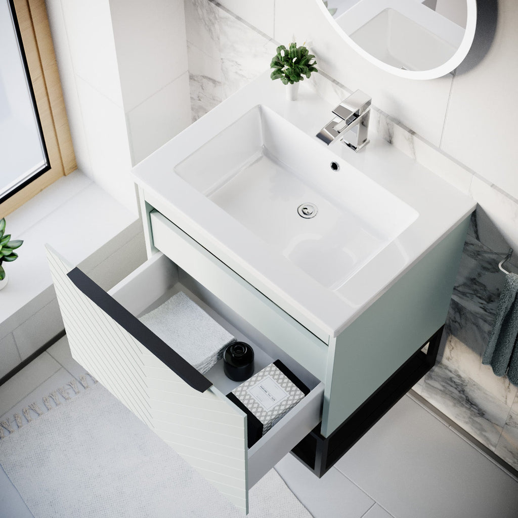 The Wall Hung Drawers Basin Vanity, Black Frame, Handle has an aesthetic symmetry textured design making the vanity unit complement to any modern bathroom. This vanity unit provides ample space of storage with two drawers to store your bathroom essentials. The drawers feature a brushed finishing handle for easy access. The soft-close mechanism ensures gentle and quiet use without slamming. This vanity unit is a wall-mounted design. Along with a framed shelf for extra storage, it gives you an unclutter look with freeing up floor space. It is made from 100% moisture-resistant MDF, topped with a durable and easy to clean basin sink. This vanity unit is an excellent option that will bring a touch of luxury style and functionality to your bathroom. It's time to upgrade your space!