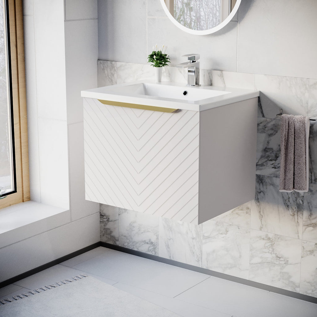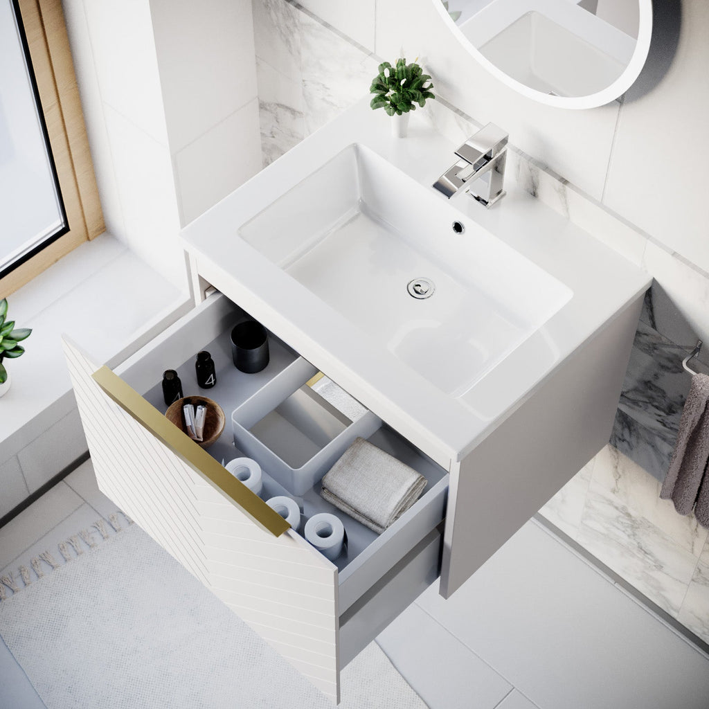 The Wall Hung Drawers Basin Vanity with Brushed Brass Handle has an aesthetic symmetry textured design making the vanity unit complement to any modern bathroom. This vanity unit provides ample space of storage with two drawers to store your bathroom essentials. The drawers feature a brushed finishing handle for easy access. The soft-close mechanism ensures gentle and quiet use without slamming. This vanity unit is a wall-mounted design which gives you an unclutter look with freeing up floor space. It is made from 100% moisture-resistant MDF, topped with a durable and easy to clean basin sink. This vanity unit is an excellent option that will bring a touch of luxury style and functionality to your bathroom. It's time to upgrade your space!