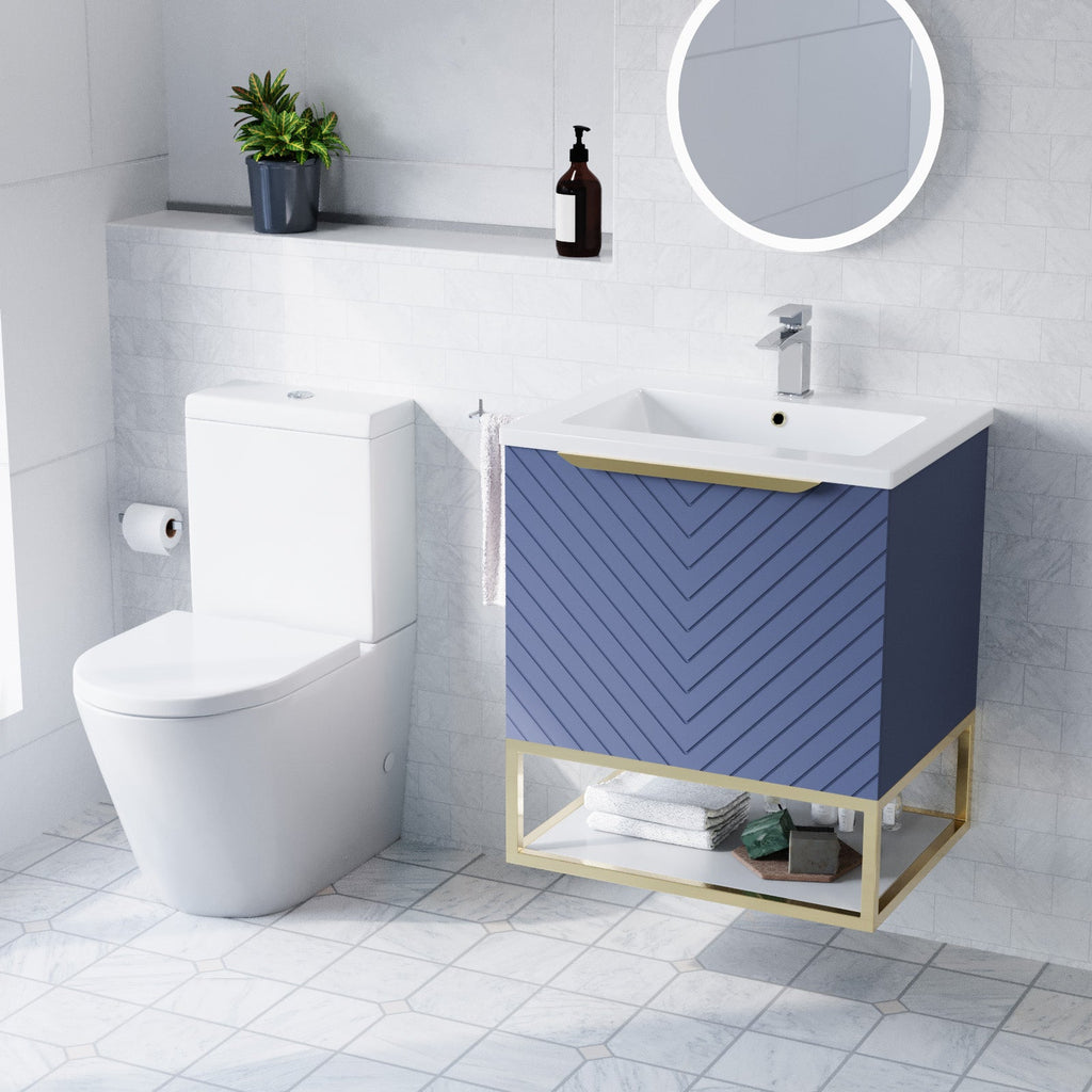 The Wall Hung Drawers Basin Vanity, Brushed Brass Frame, Handle has an aesthetic symmetry textured design making the vanity unit complement to any modern bathroom. This vanity unit provides ample space of storage with two drawers to store your bathroom essentials. The drawers feature a brushed finishing handle for easy access. The soft-close mechanism ensures gentle and quiet use without slamming. This vanity unit is a wall-mounted design. Along with a framed shelf for extra storage, it gives you an unclutter look with freeing up floor space. It is made from 100% moisture-resistant MDF, topped with a durable and easy to clean basin sink. This vanity unit is an excellent option that will bring a touch of luxury style and functionality to your bathroom. It's time to upgrade your space!