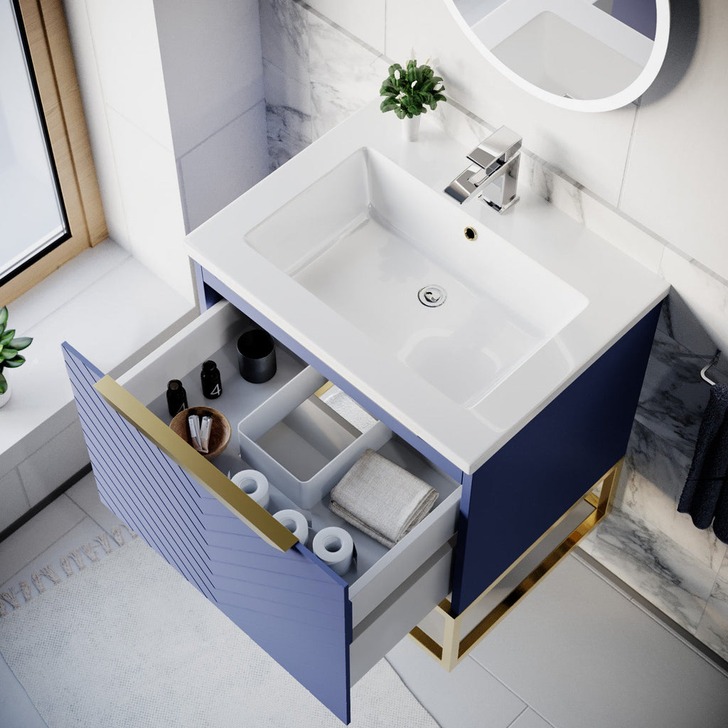 The Wall Hung Drawers Basin Vanity, Brushed Brass Frame, Handle has an aesthetic symmetry textured design making the vanity unit complement to any modern bathroom. This vanity unit provides ample space of storage with two drawers to store your bathroom essentials. The drawers feature a brushed finishing handle for easy access. The soft-close mechanism ensures gentle and quiet use without slamming. This vanity unit is a wall-mounted design. Along with a framed shelf for extra storage, it gives you an unclutter look with freeing up floor space. It is made from 100% moisture-resistant MDF, topped with a durable and easy to clean basin sink. This vanity unit is an excellent option that will bring a touch of luxury style and functionality to your bathroom. It's time to upgrade your space!