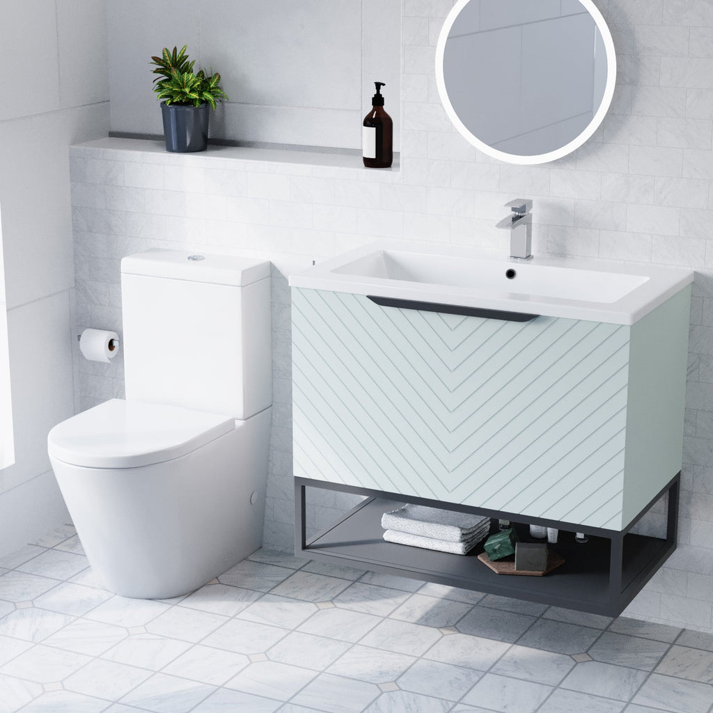 The Wall Hung Drawers Basin Vanity, Black Frame, Handle has an aesthetic symmetry textured design making the vanity unit complement to any modern bathroom. This vanity unit provides ample space of storage with two drawers to store your bathroom essentials. The drawers feature a brushed finishing handle for easy access. The soft-close mechanism ensures gentle and quiet use without slamming. This vanity unit is a wall-mounted design. Along with a framed shelf for extra storage, it gives you an unclutter look with freeing up floor space. It is made from MDF with a water-resistant coating, topped with a durable and easy to clean basin sink. This vanity unit is an excellent option that will bring a touch of luxury style and functionality to your bathroom. It's time to upgrade your space!