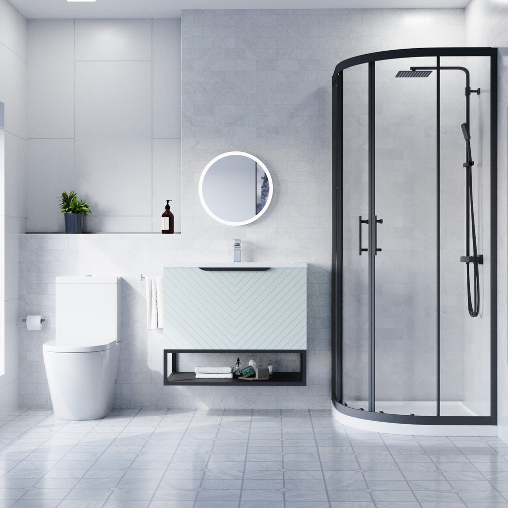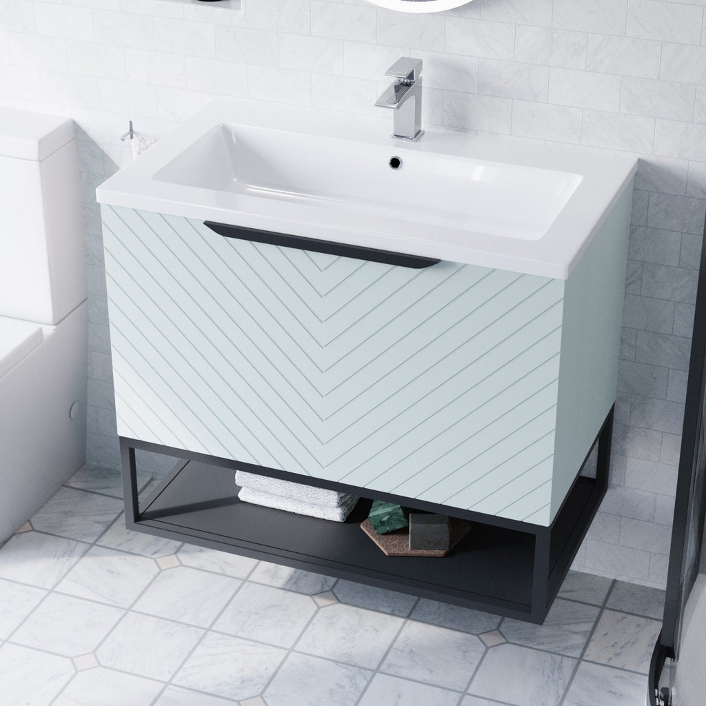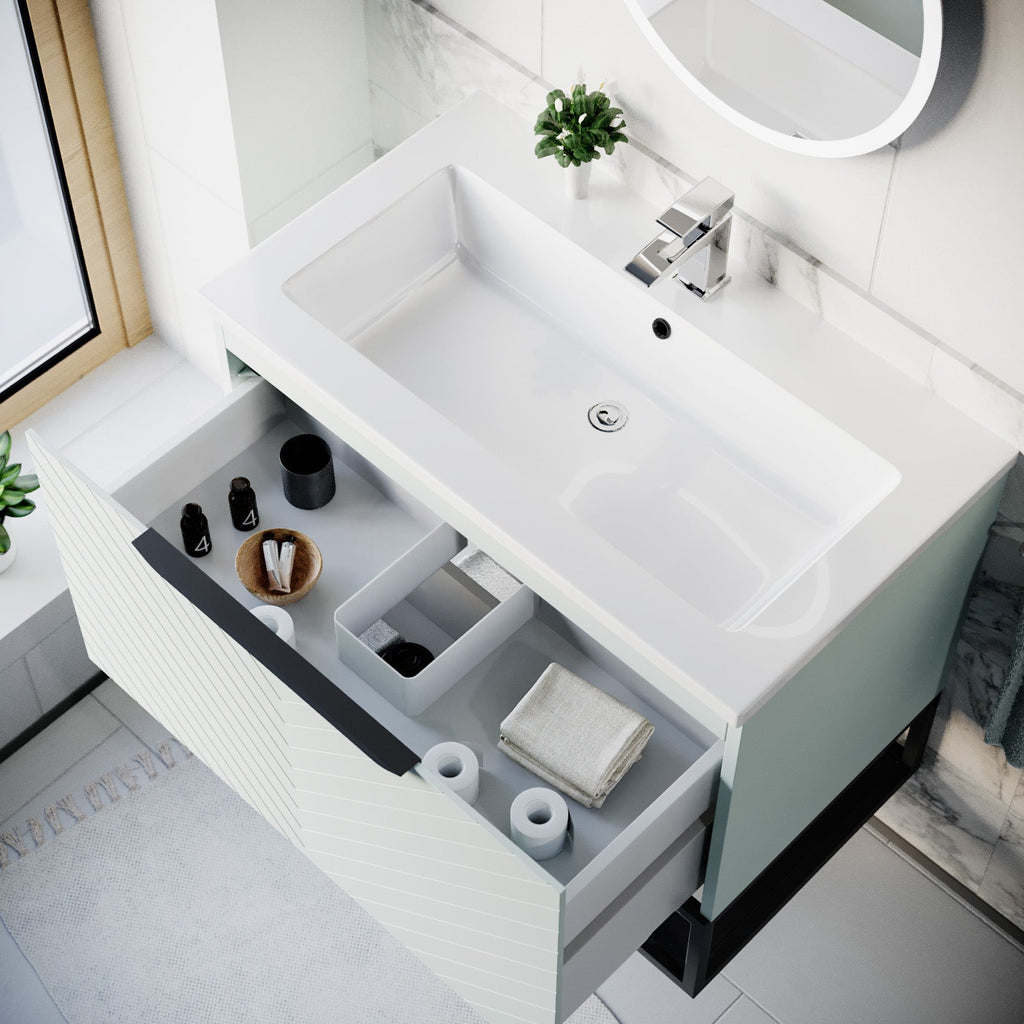 The Wall Hung Drawers Basin Vanity, Black Frame, Handle has an aesthetic symmetry textured design making the vanity unit complement to any modern bathroom. This vanity unit provides ample space of storage with two drawers to store your bathroom essentials. The drawers feature a brushed finishing handle for easy access. The soft-close mechanism ensures gentle and quiet use without slamming. This vanity unit is a wall-mounted design. Along with a framed shelf for extra storage, it gives you an unclutter look with freeing up floor space. It is made from MDF with a water-resistant coating, topped with a durable and easy to clean basin sink. This vanity unit is an excellent option that will bring a touch of luxury style and functionality to your bathroom. It's time to upgrade your space!