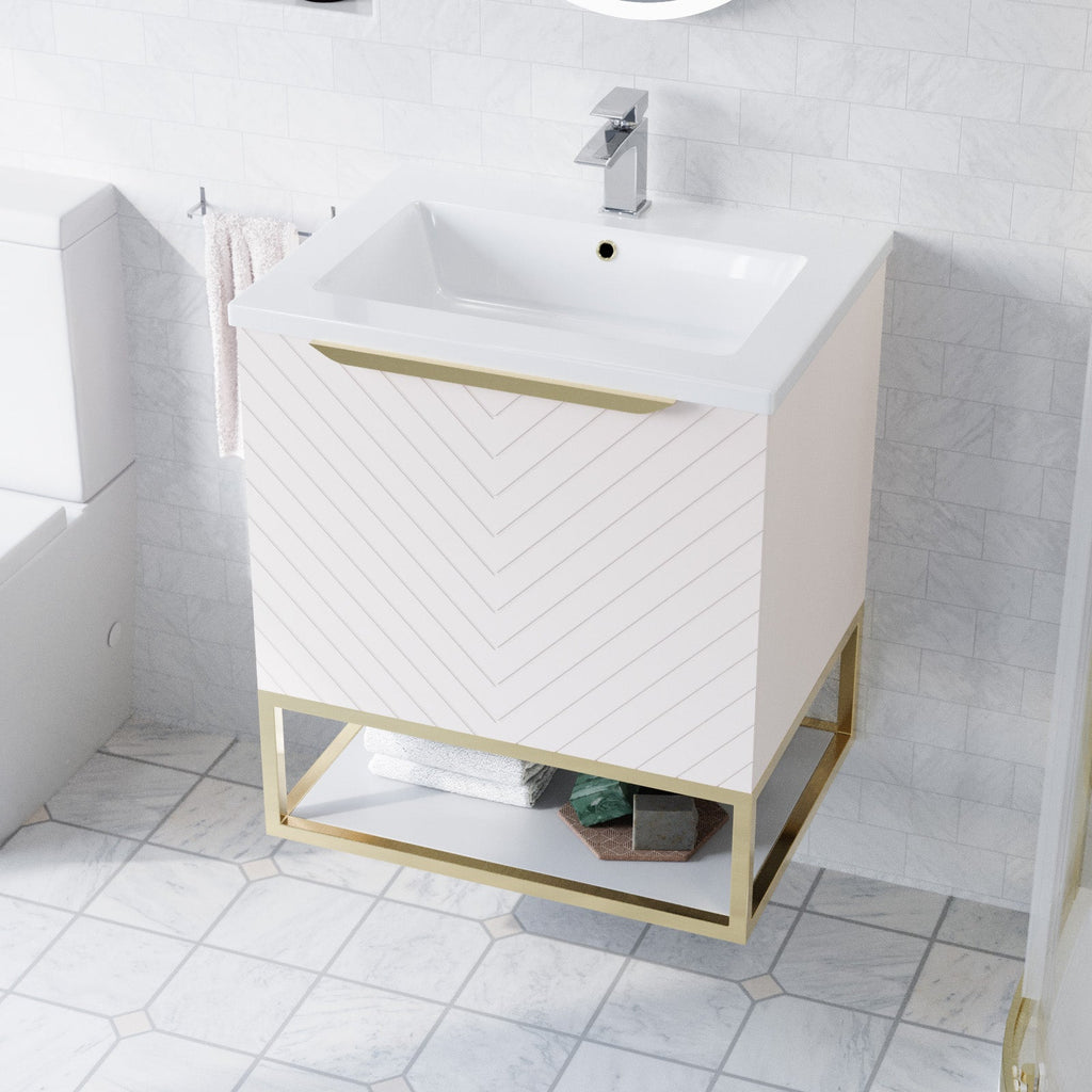 The Wall Hung Drawers Basin Vanity, Brushed Brass Frame, Handle has an aesthetic symmetry textured design making the vanity unit complement to any modern bathroom. This vanity unit provides ample space of storage with two drawers to store your bathroom essentials. The drawers feature a brushed finishing handle for easy access. The soft-close mechanism ensures gentle and quiet use without slamming. This vanity unit is a wall-mounted design. Along with a framed shelf for extra storage, it gives you an unclutter look with freeing up floor space. It is made from 100% moisture-resistant MDF, topped with a durable and easy to clean basin sink. This vanity unit is an excellent option that will bring a touch of luxury style and functionality to your bathroom. It's time to upgrade your space!