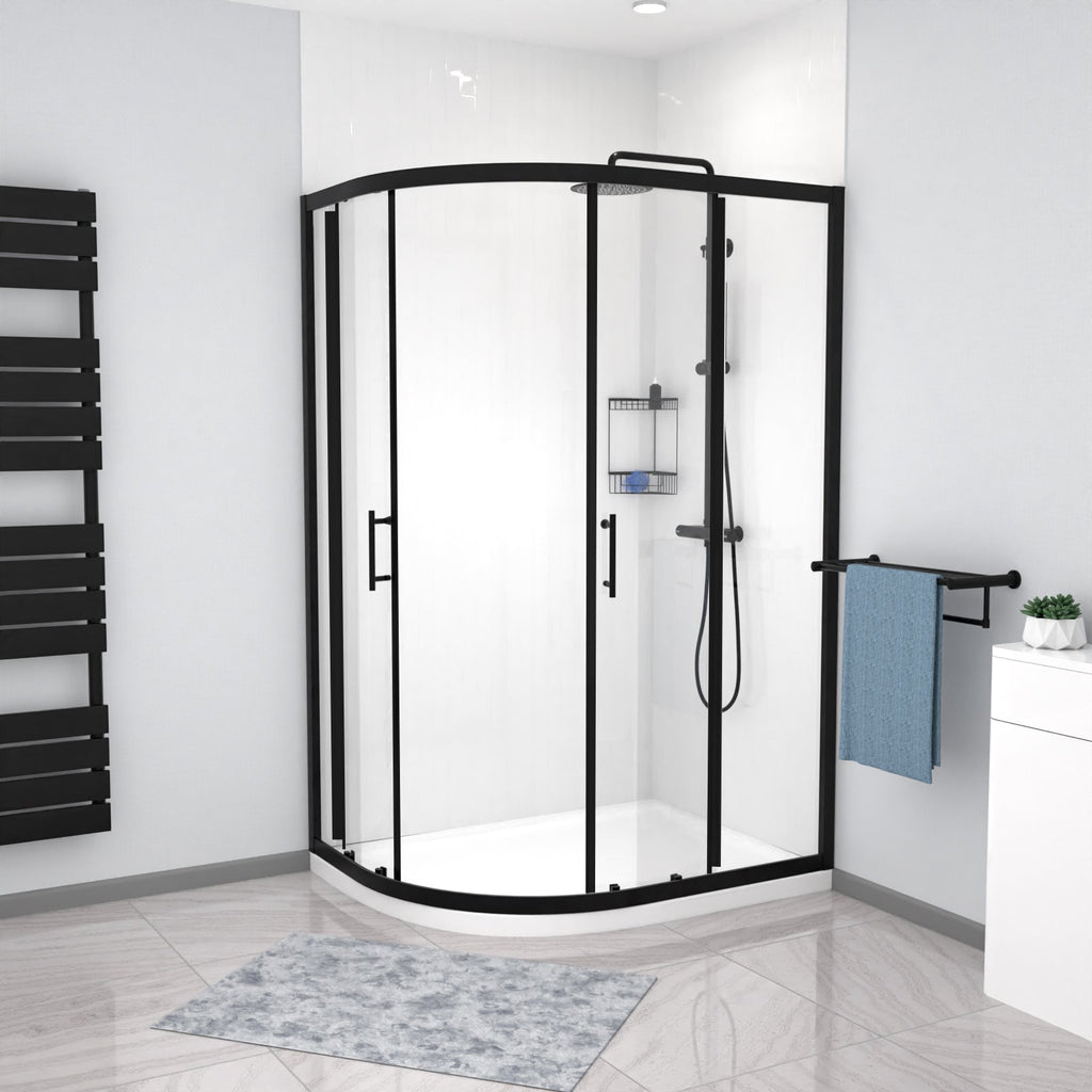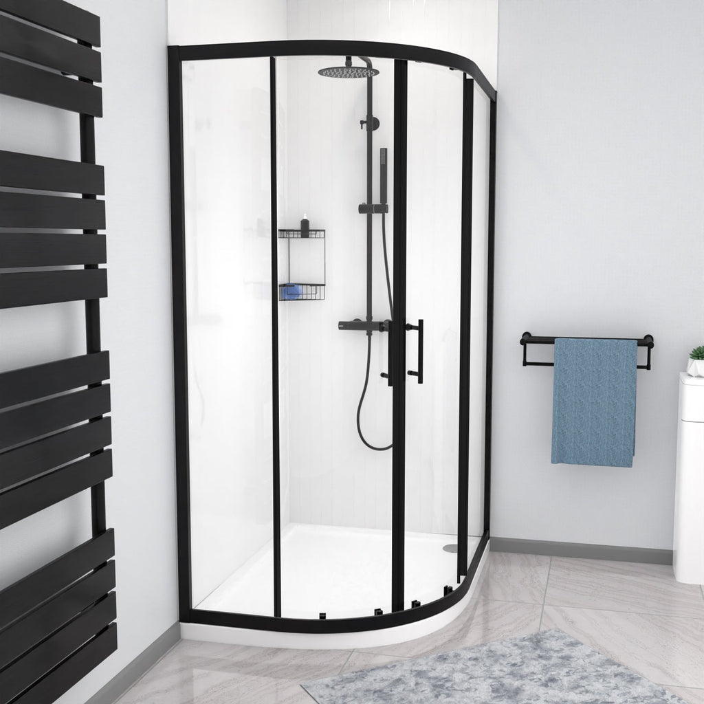 This quadrant shower enclosure in a black finish comes with 6mm tempered glass which is specifically easy-clean-glass. The shower doors with a smooth, sliding mechanism and black shower door handles gives this shower an elegant feel. It’s not a problem if your walls are slightly positioned at the wrong angle as this enclosure adjusts by 20mm. The black finish will compliment the interiors and gives a modern look to the corner of your bath or shower room. Matching, taps and mirrors are also available.
