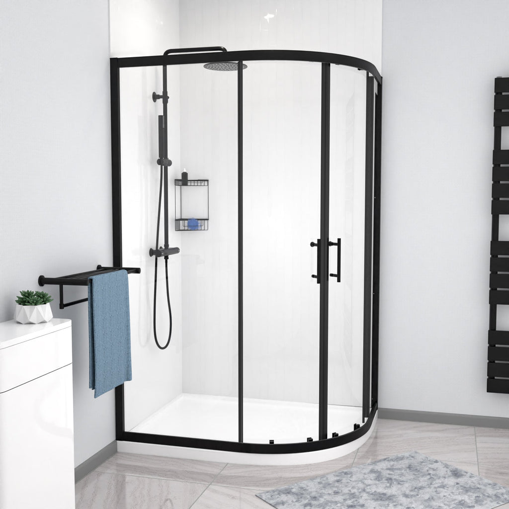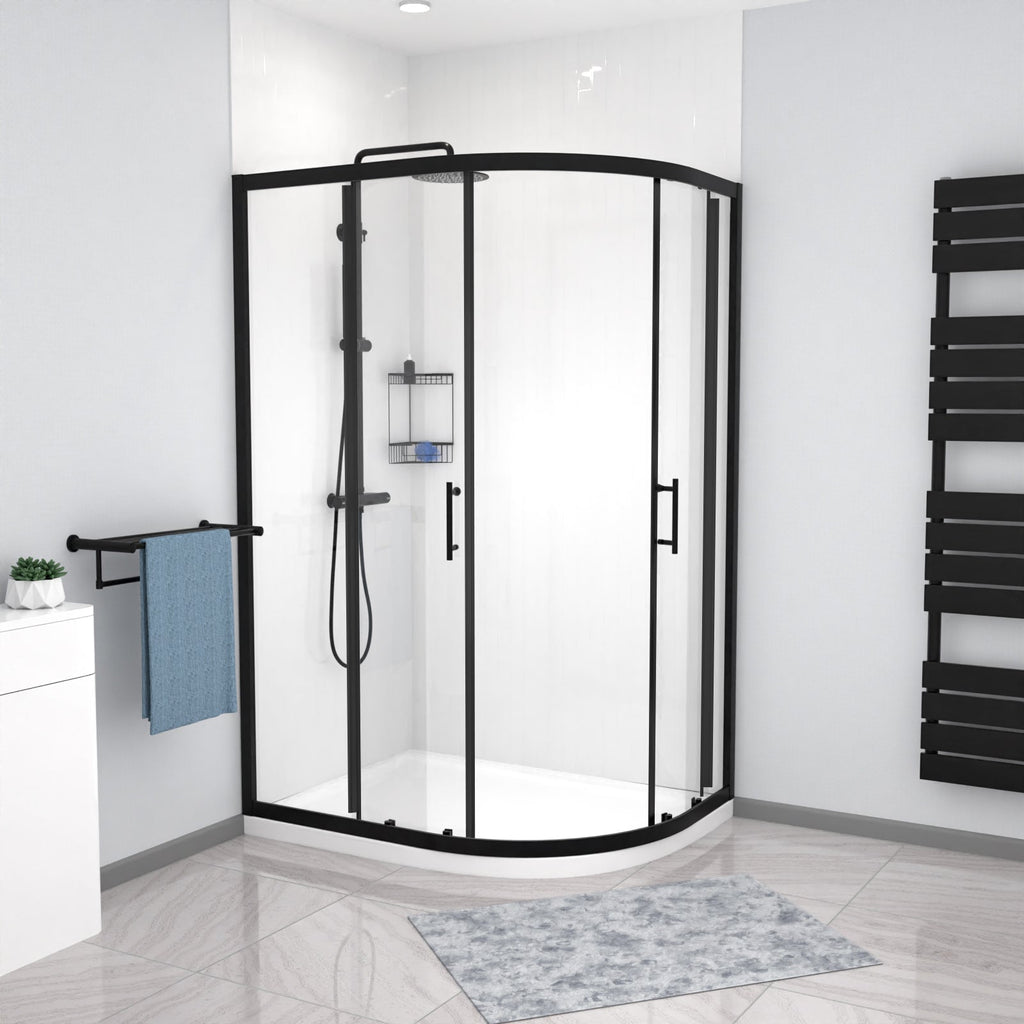 This quadrant shower enclosure in a matt black finish comes with 6mm tempered glass which is specifically easy-clean-glass. The shower doors with a smooth, sliding mechanism and shower door handles gives this shower an elegant feel. It’s not a problem if your walls are slightly positioned at the wrong angle as this enclosure adjusts by 20mm. The shower enclosure also comes with a low profile shower tray and a removable waste. The finish will compliment contrasting light or dark coloured interiors and gives a modern look to the corner of your bath or shower room. Matching, taps and mirrors are also available.