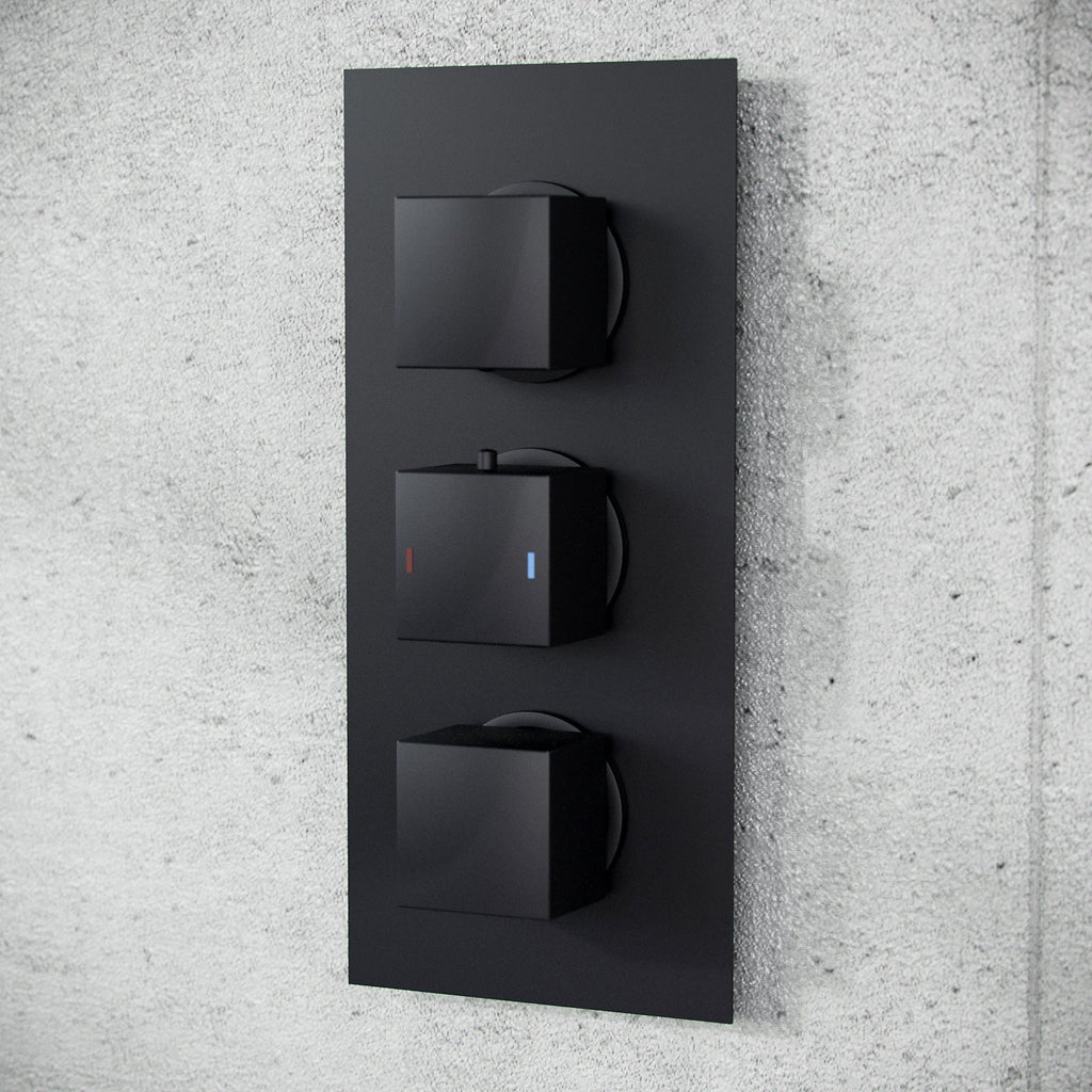 Constructed from solid brass, with modern ceramic disc technology, our stylish concealed thermostatic shower mixer valve is perfect for creating a new minimalist look to your bathroom. The mixer valve mounts on to the wall making your shower look less cluttered and bulky and the slim rectangular back plate neatly conceals all pipe work, adding an exceptional sleek finish. Featuring classic square dials - the mixer valve supplies water to 2 outlet diverters and is finished in stunning matt black, leaving am, making your taps look new for longer. The thermostatic showering can be accessed via the 3 dial 3 way easy-to-operate dial controls - separate controls for temperature and flow; giving you full temperature control. A coordinating fixed wall mounted overhead shower with a swivel joint and arm for ease of use come complete with the mixer valve. Please note: These product comes with a 10 year guarantee.