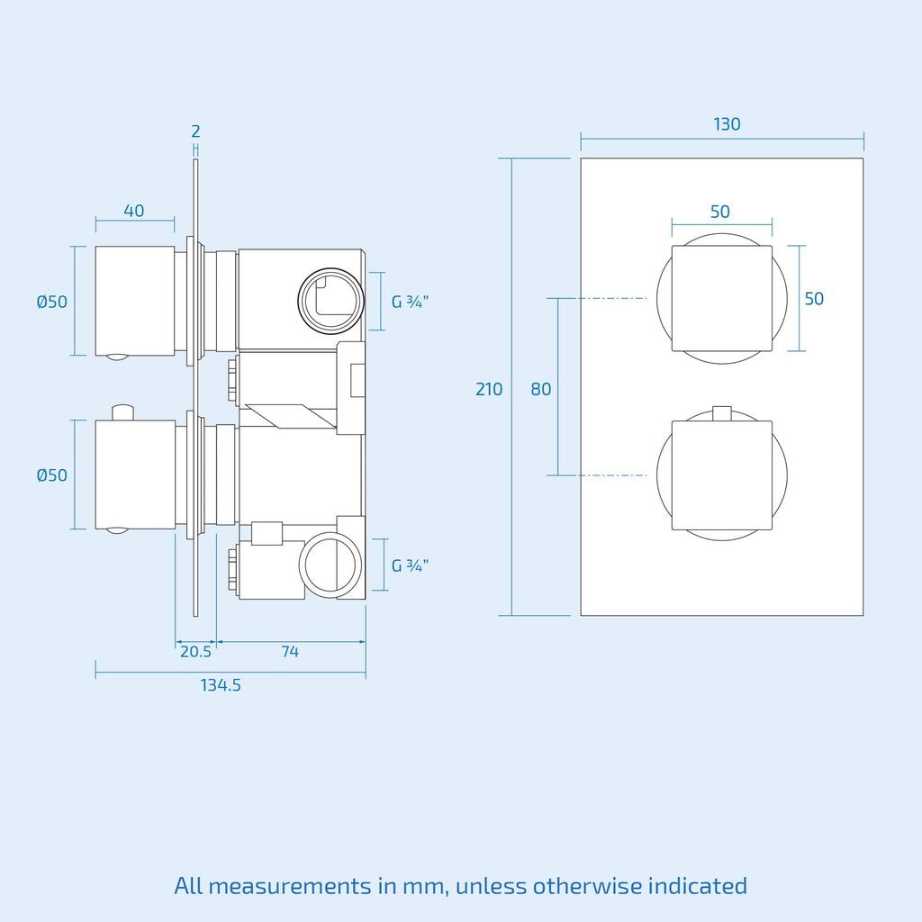 Enhance your bathroom with a beautiful complete 2 dial 2 way concealed thermostatic shower set featuring a shower head and handset for ultimate shower versatility. The concealed valve offers thermostatic showering via two easy-to-operate controls, for temperature and flow.