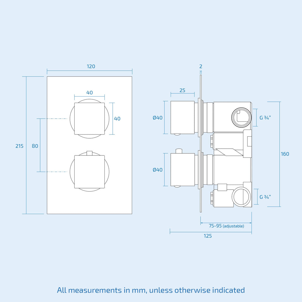 Constructed from solid brass, with modern ceramic disc technology, our stylish concealed thermostatic shower mixer valve is perfect for creating a new minimalistic look to your bathroom. The mixer valve mounts on to the wall making your shower look less cluttered and bulky and the slim rectangular back plate neatly conceals all pipe work, adding an exceptional sleek finish. Featuring square dials with short levers for fingertip control, the mixer valve supplies water to 2 outlet diverters and is finished in stunning black matt making your taps look new for longer. The thermostatic showering can be accessed via the 2 dial 2 way easy-to-operate dial controls - separate controls for temperature and flow; giving you full temperature control.