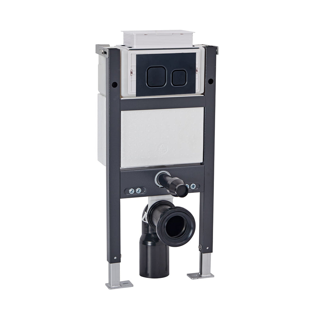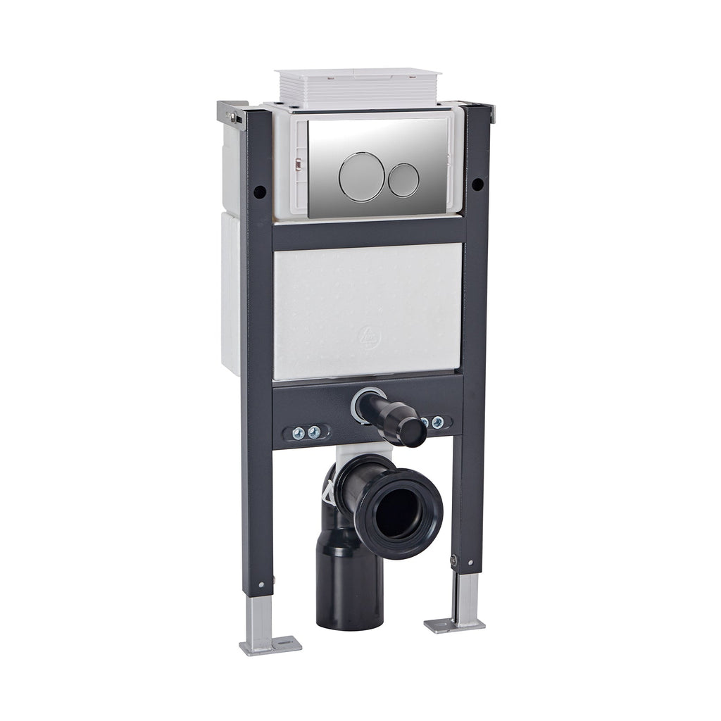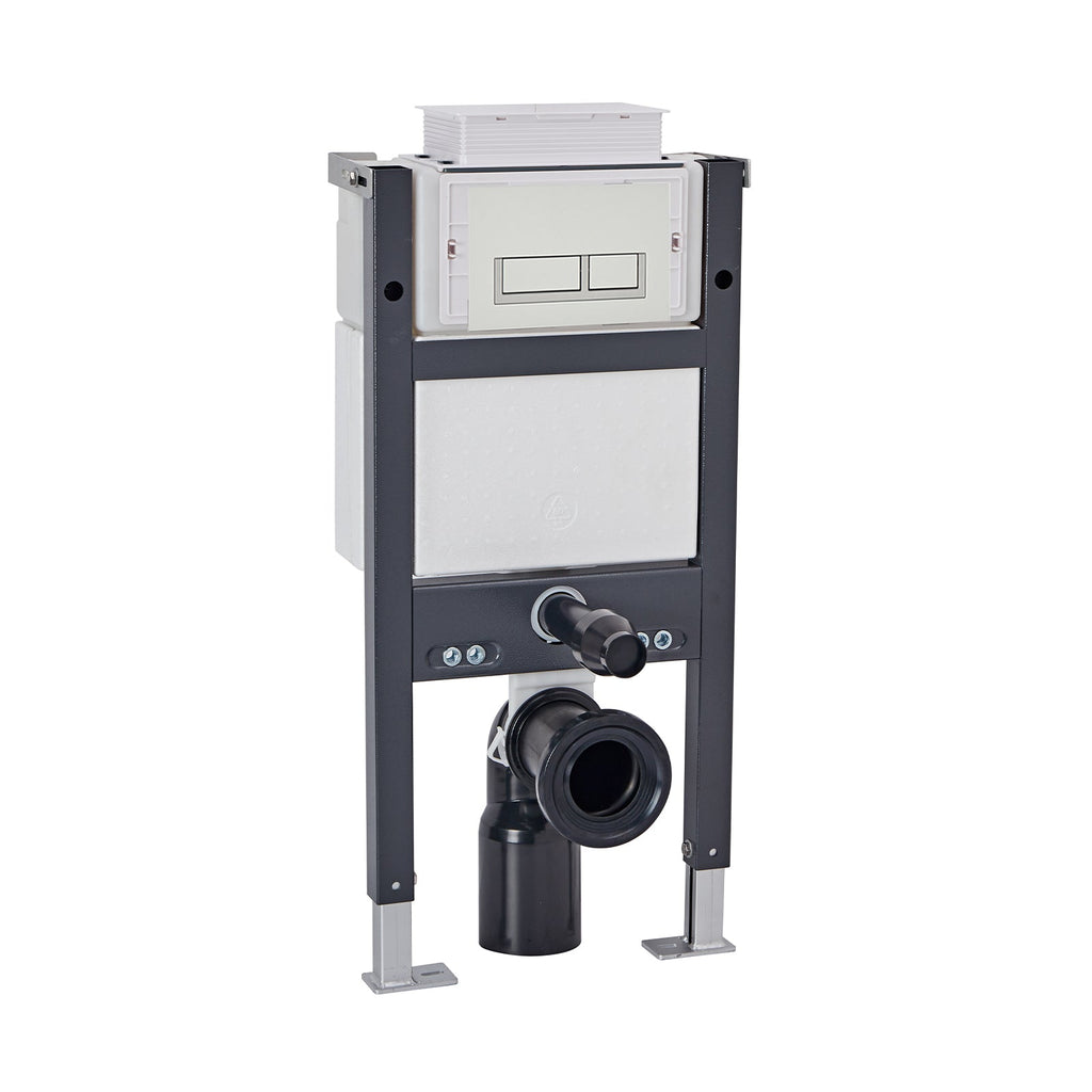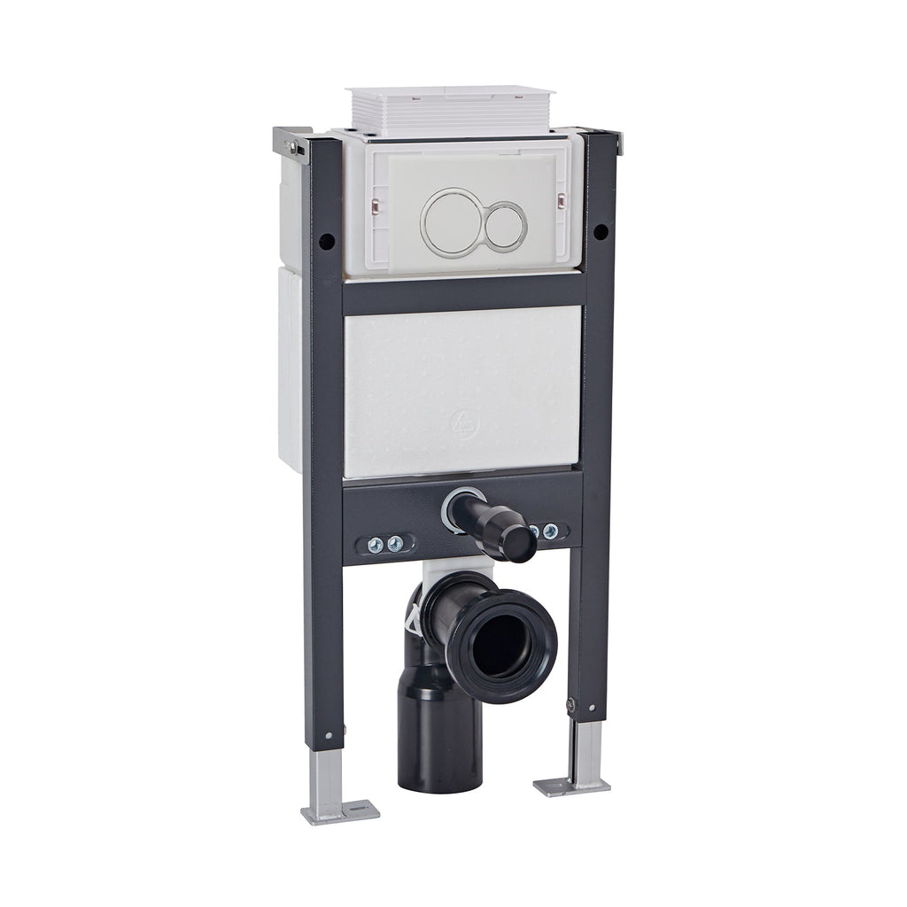 The toilet frame is compatible with all wall-hung WC pans. It features a front or top flush design with buttons. This frame offers robust support for your wall-hung toilet, ensuring durability and longevity. The dual flush cistern is designed to reduce water consumption and promote sustainability. Additionally, the frame is adjustable in both height and depth, allowing for an optimal fit and seamless integration with your toilet. Its sleek, minimalist design enhances the overall aesthetic of the bathroom. The frame is an excellent option for any renovation or upgrade, thanks to its stability, water-saving features, and contemporary design.