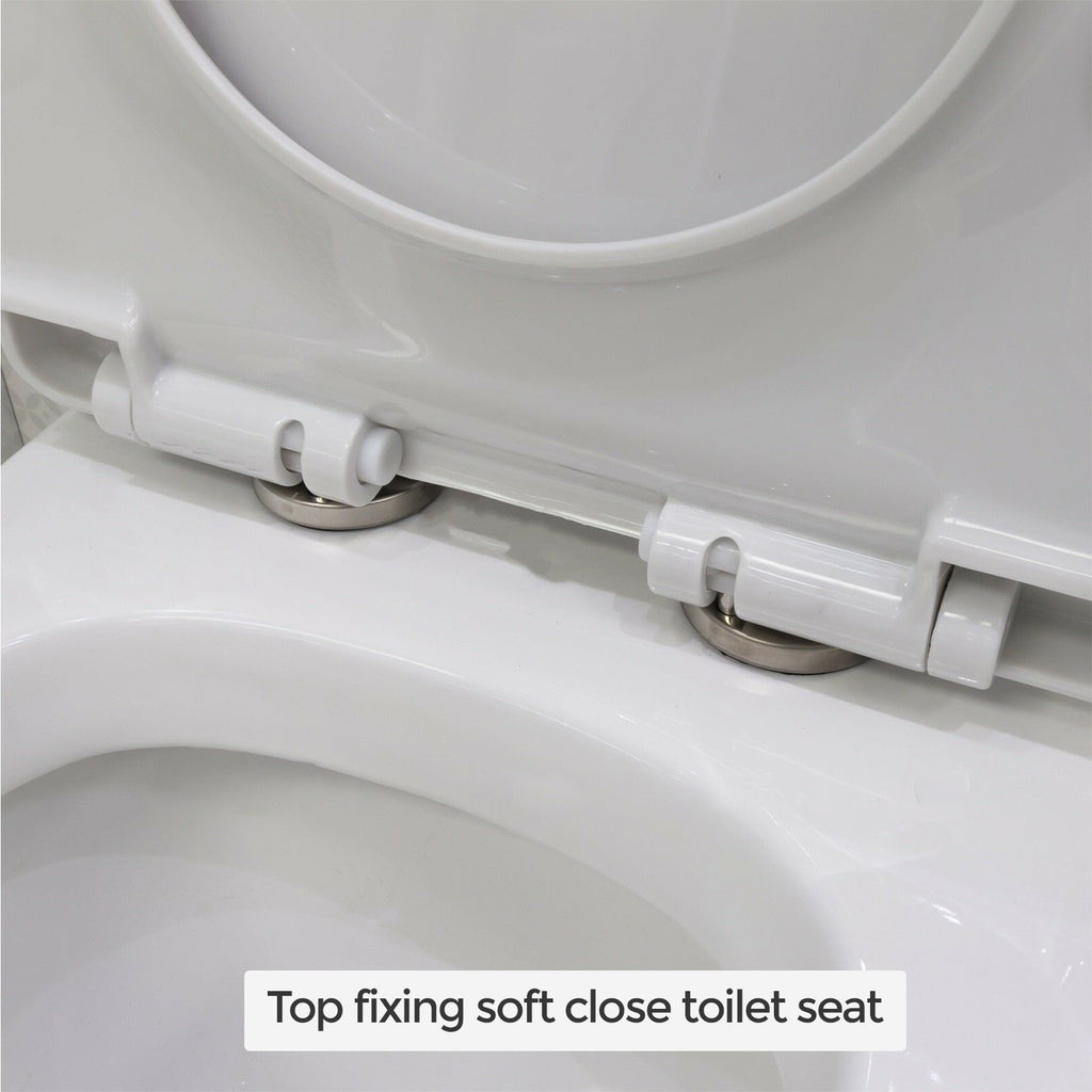 - Toilet Seat: Top fixing, soft close seat, and cover