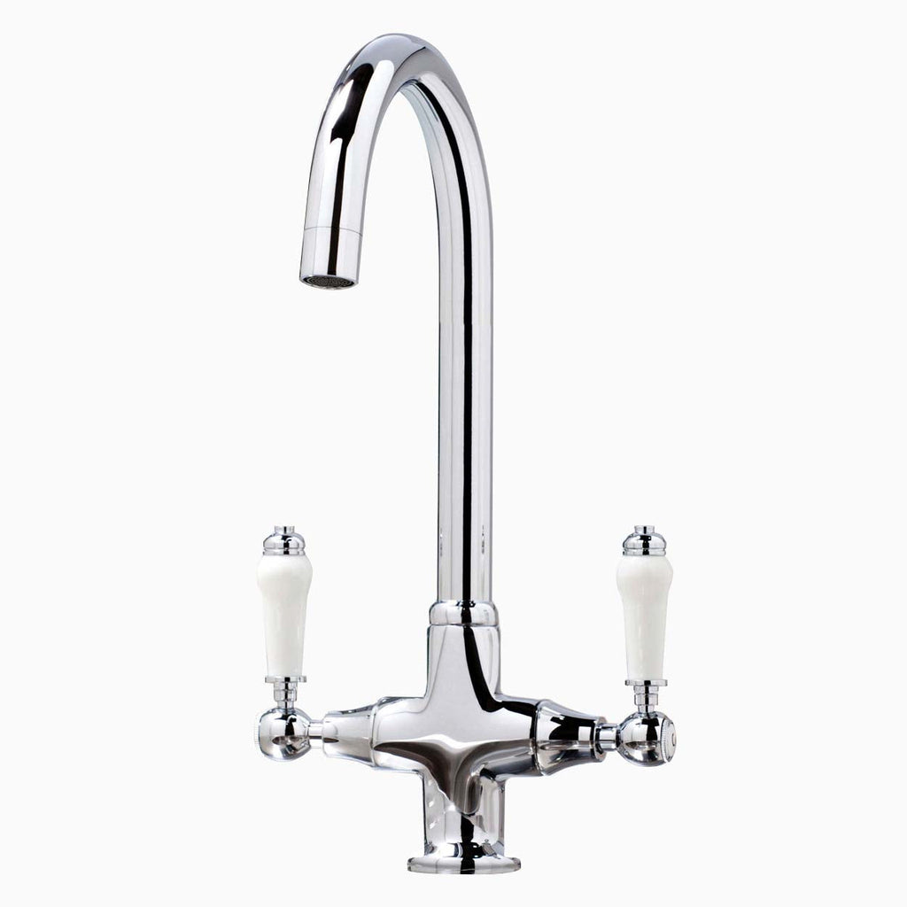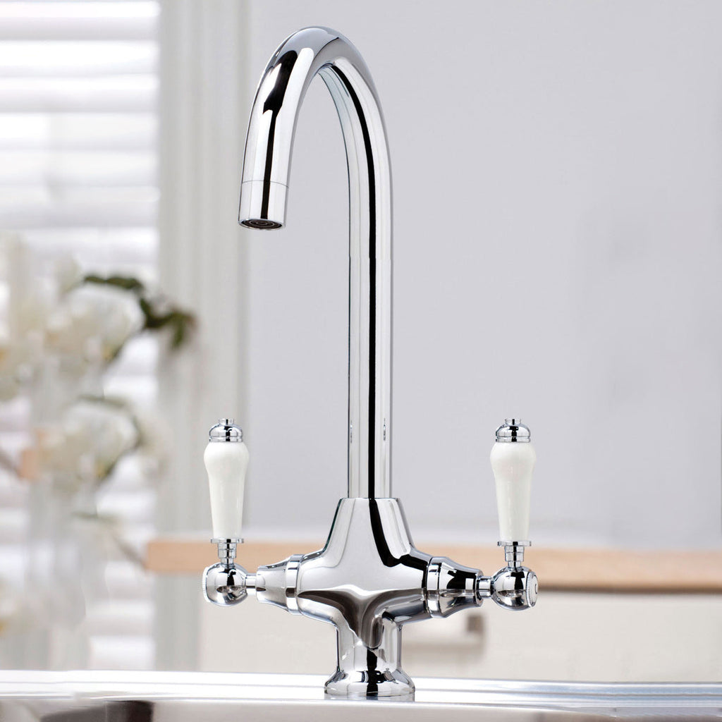 The chrome kitchen sink mono-mixer tap adds a traditional and stylish touch to any kitchen. Featuring beautiful white handles and a smooth round 360 degrees swivel spout, with a highly reflective chrome finish.