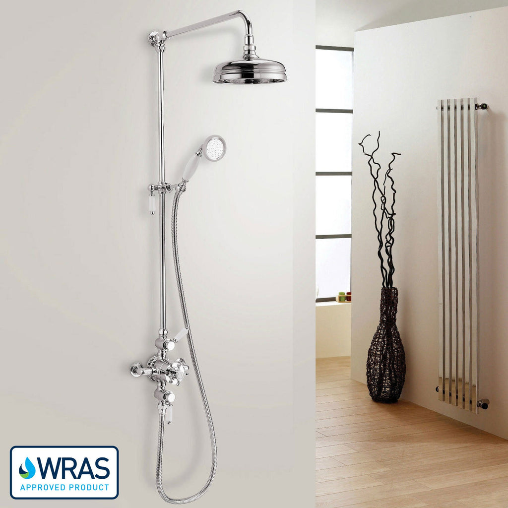This complete traditional timeless bathroom shower kit is suitable for classically decorated bathrooms. It comes with a round shower head, handset shower, adjustable bracket, and thermostatic bar valve. Made of solid brass construction and comes in a mirror-shine chrome finish giving the bathroom an added touch of luxury.