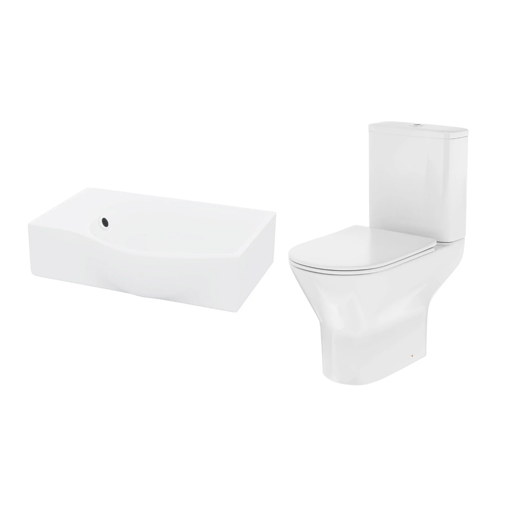 The perfect combination of style, space-saving design, and everyday practicality for small bathrooms and cloakrooms. This coordinated set pairs the sleek cloakroom rectangle basin sink, designed for minimalist spaces, with the Alexa modern close-coupled rimless toilet, featuring a soft-close seat and dual-flush system. Each component is engineered for modern interiors, offering effortless hygiene, comfortable use, and streamlined aesthetics, making this bundle ideal for compact bathrooms and cloakroom installations.