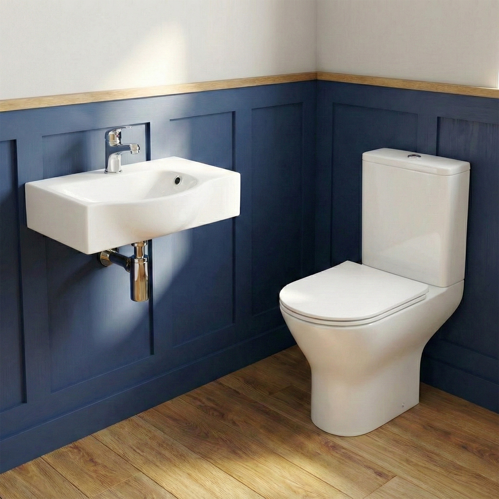 The perfect combination of style, space-saving design, and everyday practicality for small bathrooms and cloakrooms. This bundle pairs the contemporary Oakham rimless close-coupled toilet with soft-close seat and dual flush system, the sleek Tulla wall-hung right-hand rectangular ceramic basin, and a Studio modern chrome basin mono mixer tap for a clean, coordinated finish. Designed for modern interiors, each component offers easy maintenance, hygienic performance, and a compact footprint, making this set ideal for cloakrooms and smaller bathrooms.