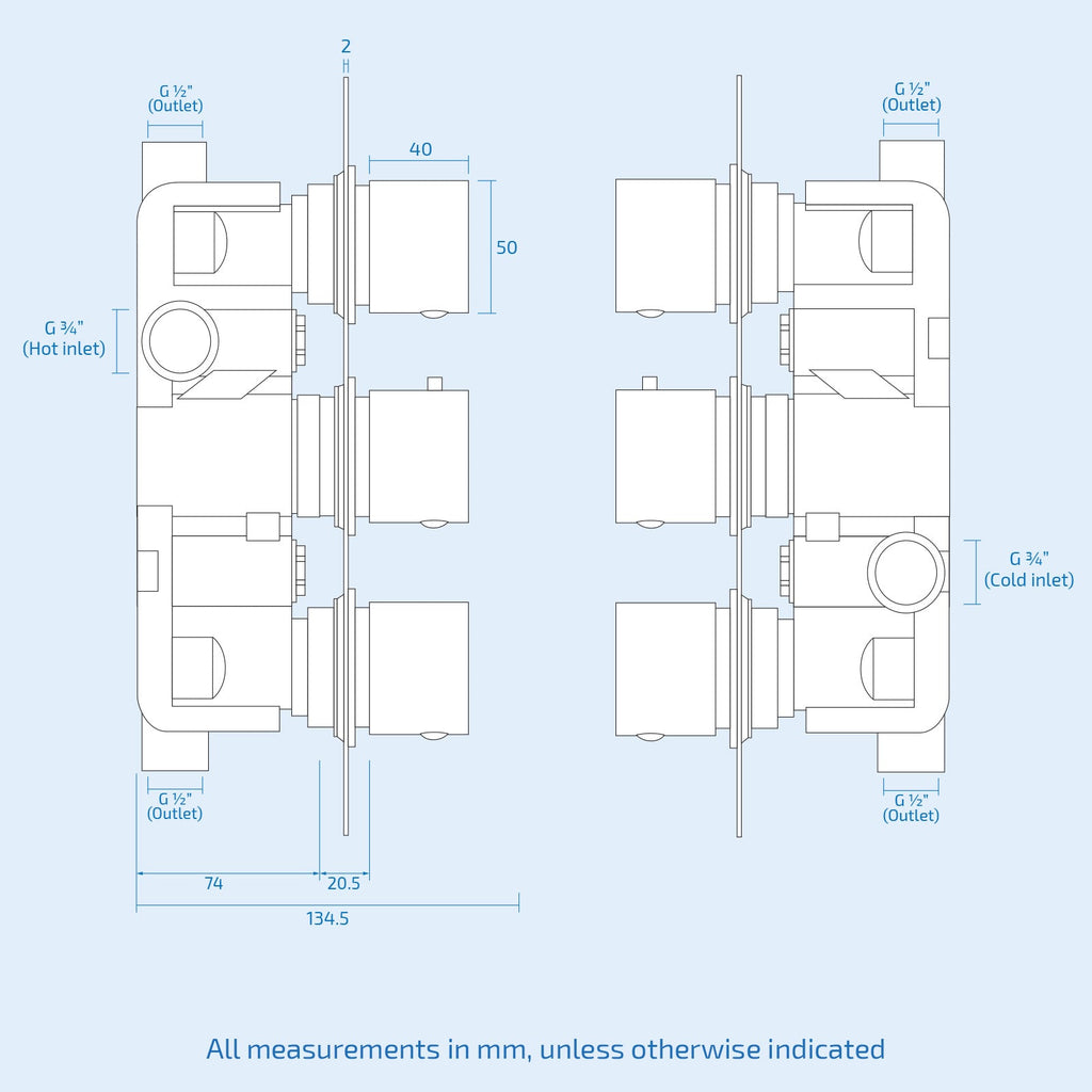 - Built in non return valves to prevent back flow and filters to protect the thermostatic mechanism