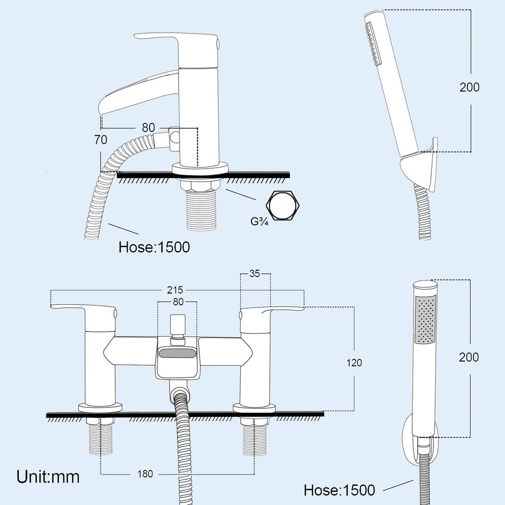 - Bath Shower Mixer: 1 x tap, 1 x abs handset, 1 x 1.5m stainless steel shower hose, 1 x bracket, 2 x fixing nut, 2 x washer