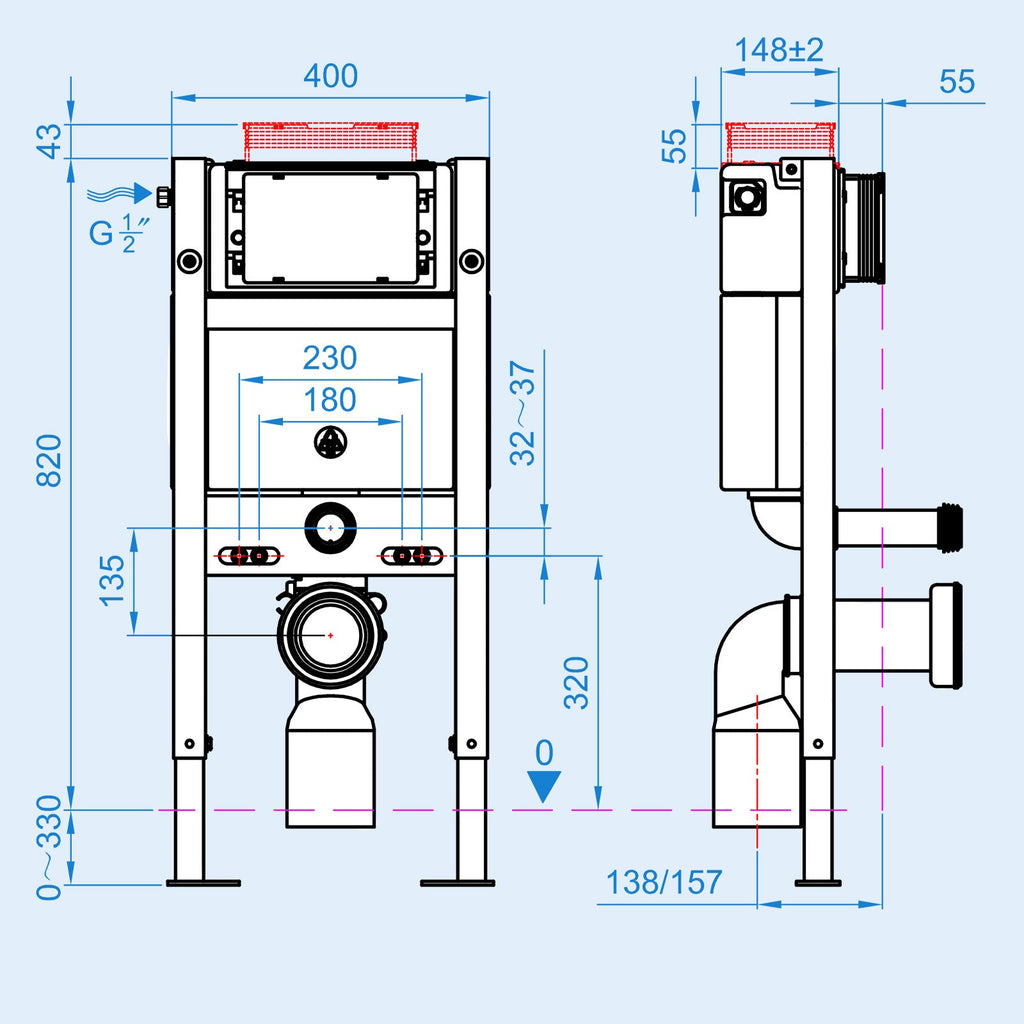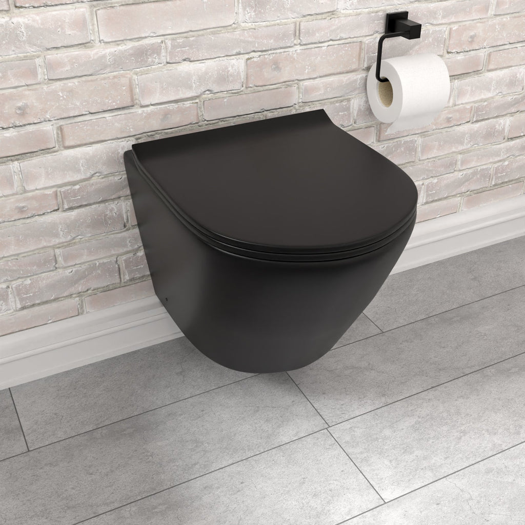 The Rimless Round Wall Hung Toilet Matte Black features an innovative design incorporating a rimless pan which halts bacteria build up and makes cleaning a breeze. Also, the soft close toilet seat and cover which makes it safe for people of all ages to use and helps prevent fingers from getting trapped. It features a dual flush cistern with flush plate and buttons. This frame offers robust support for your wall-hung toilet, ensuring durability and longevity. Additionally, the frame is adjustable in both height and depth, allowing for an optimal fit and seamless integration with your toilet. Its sleek, minimalist design enhances the overall aesthetic of the bathroom. Expertly crafted using only the finest ceramic and finished in matte black, this superb piece would be the perfect companion for any modern minimalist aesthetic.