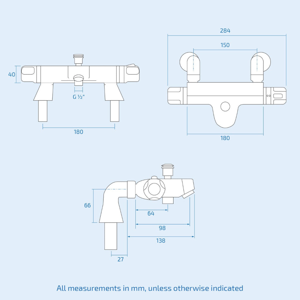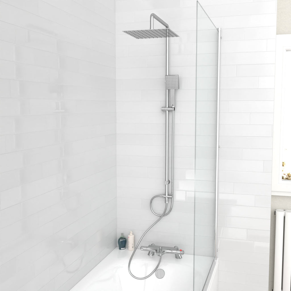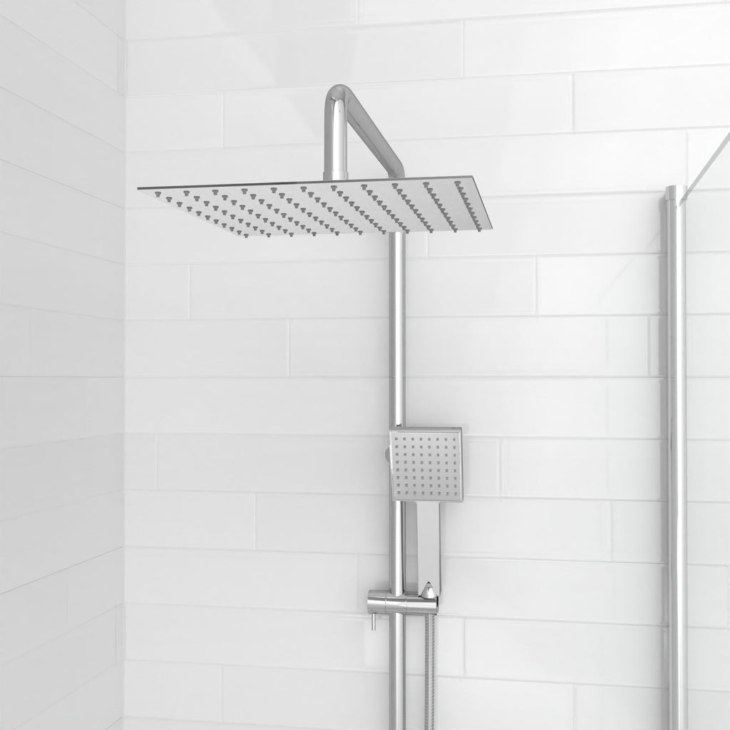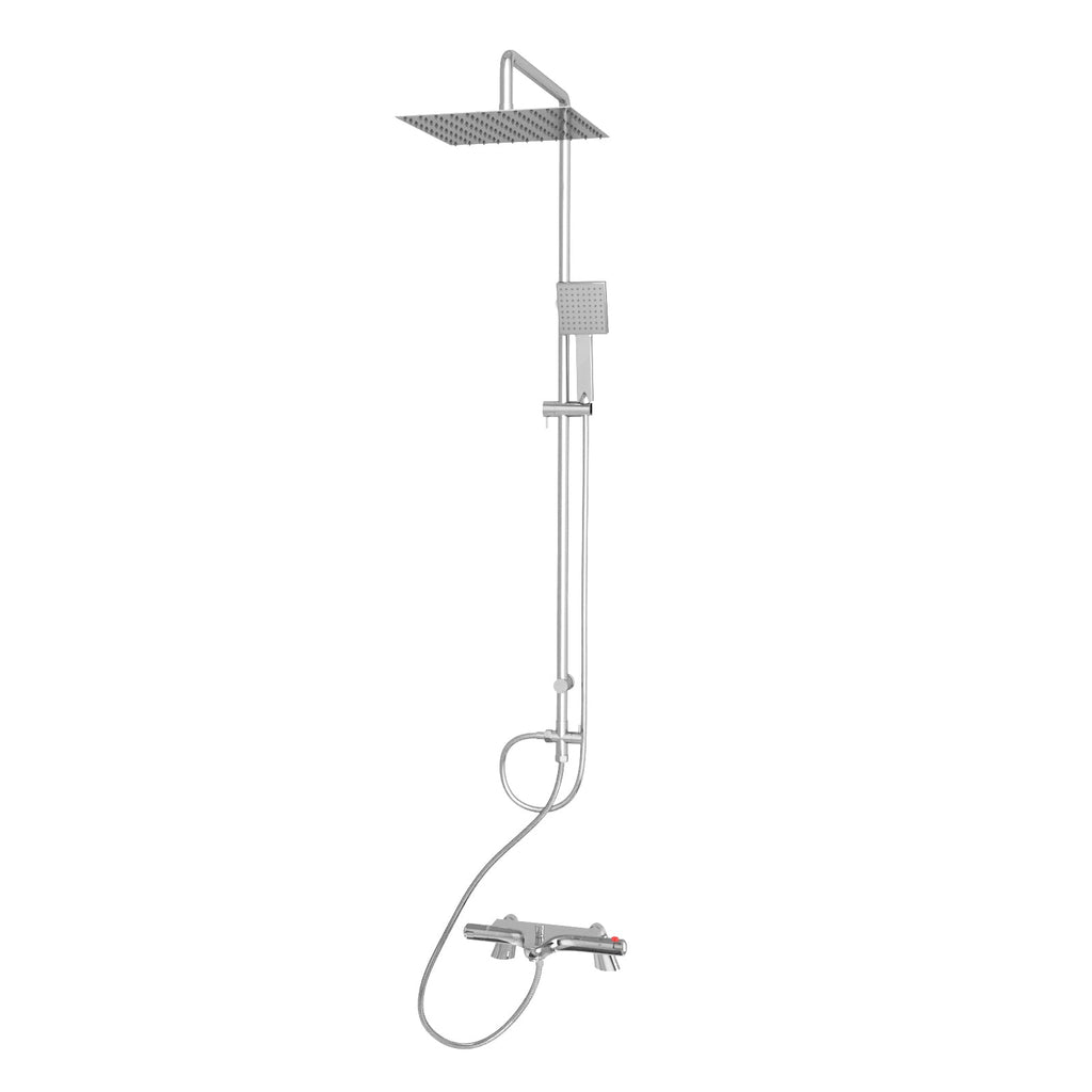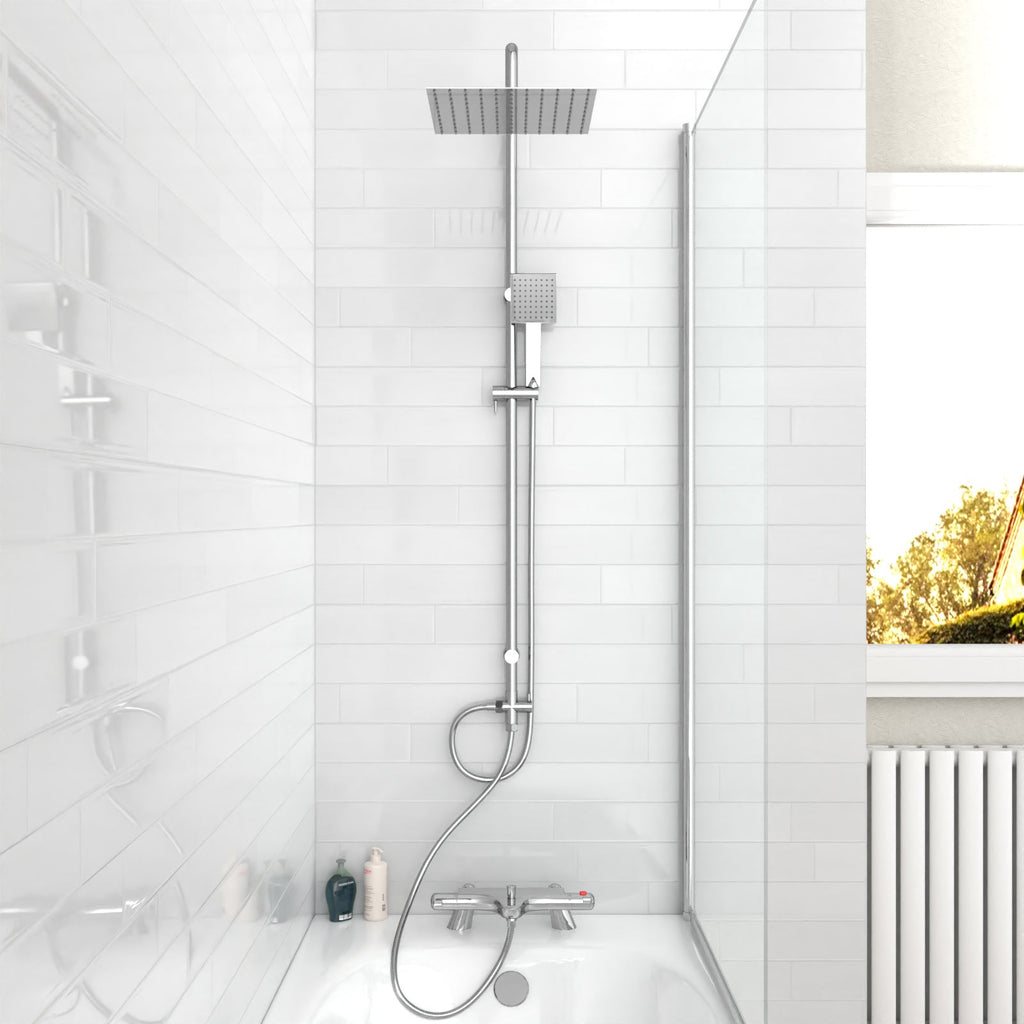 The modern exposed multi function riser slide shower rail kit will add the perfect touch to your bathroom. A solid brass square shower head, bath mixer tap and handset pack in a sleek design. An excellent cost effective showering solution. This contemporary thermostatic bath shower mixer is suitable for shower and bath areas. The easy to use thermostatic mixer tap comes with an on/off function on the left and the temperature control on the right. The pull-up diverter knob controls the transition between the bath filler tap and shower. There is an override stop button set at 38 degrees Celsius which provides comfort and safety during a shower.