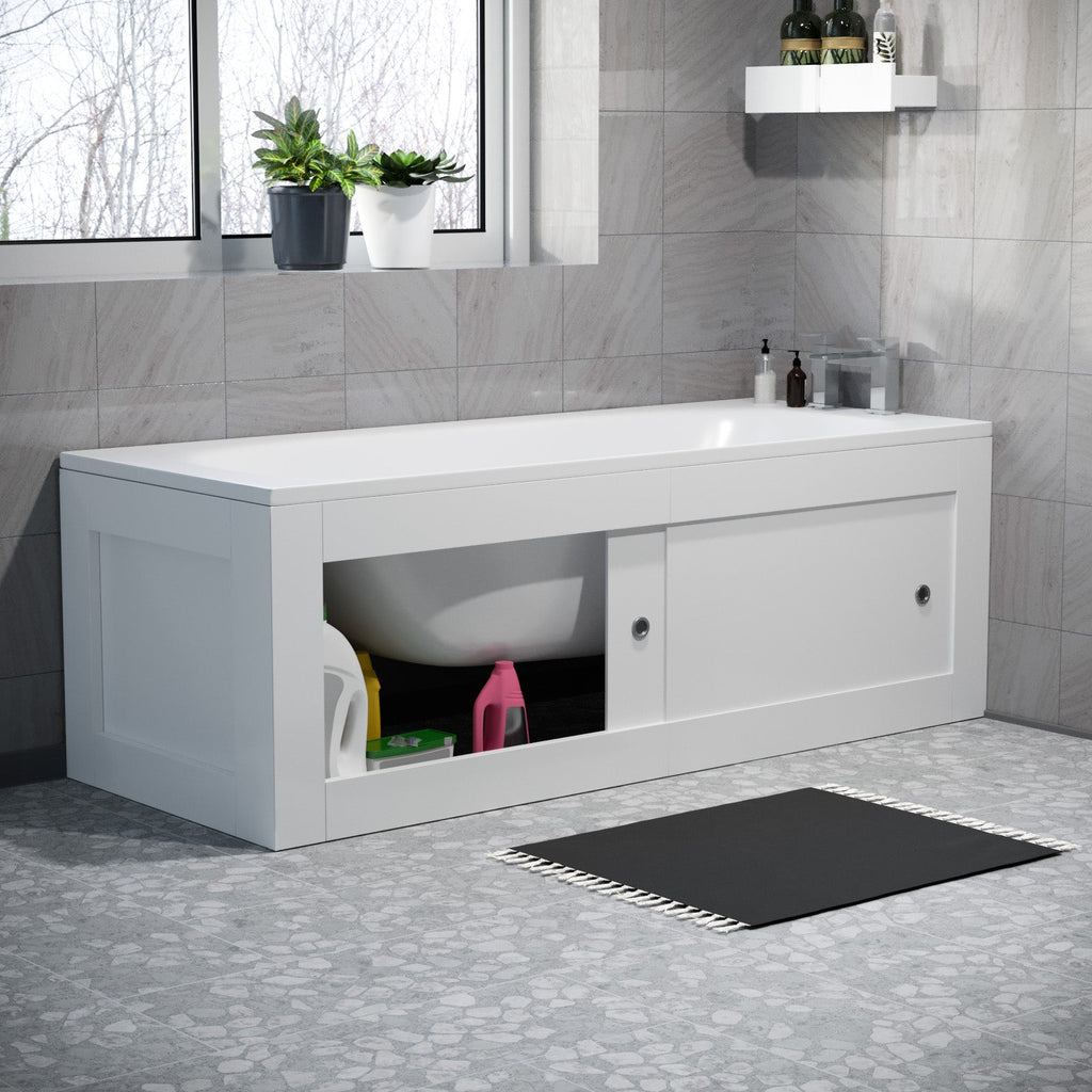 Maximize your bathroom's potential with our White PVC 1700mm 2 Sliding Doors Bath Panel. This sleek and contemporary solution creates valuable extra storage space beneath your tub, keeping your essentials neatly tucked away. The easy-access sliding doors with chrome handles provide smooth, convenient access, while the gloss white finish and hidden plinth lend a streamlined, modern aesthetic that complements any contemporary bathroom design. Designed to conceal unsightly pipes and legs, this versatile unit helps you maintain a clean, clutter-free bathroom environment. Elevate your space and optimize your storage with our Sliding Bathtub Storage Unit.