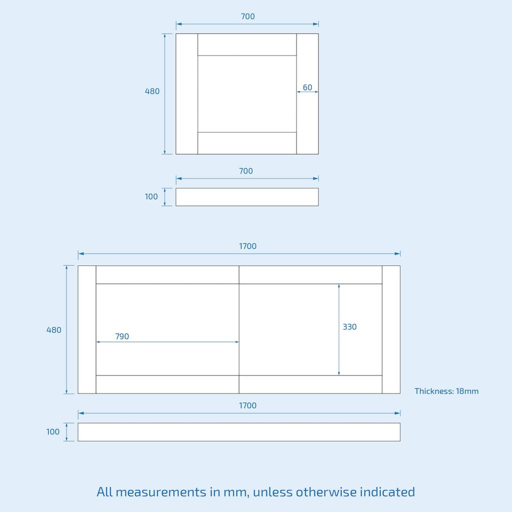 - Front Plinth: 1700 x 100mm